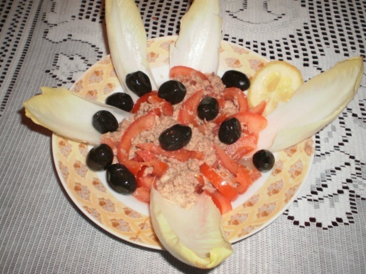 Salata de ton cu andive AntreuriFoarte ușor10 min Trimite unui prieten Printează pagina Adresează o întrebare autorului Postează o poză cu rețeta gătită de tine Ingrediente 1 conserva de ton maruntit sucul proaspat de la o jumatate de lamaie ( 180 de grame in suc propriu) sare piper 2 rosii mici proaspete 4-5 frunze de andive ceapa mica uscata galbena taiata marunt si cateva masline negre.
