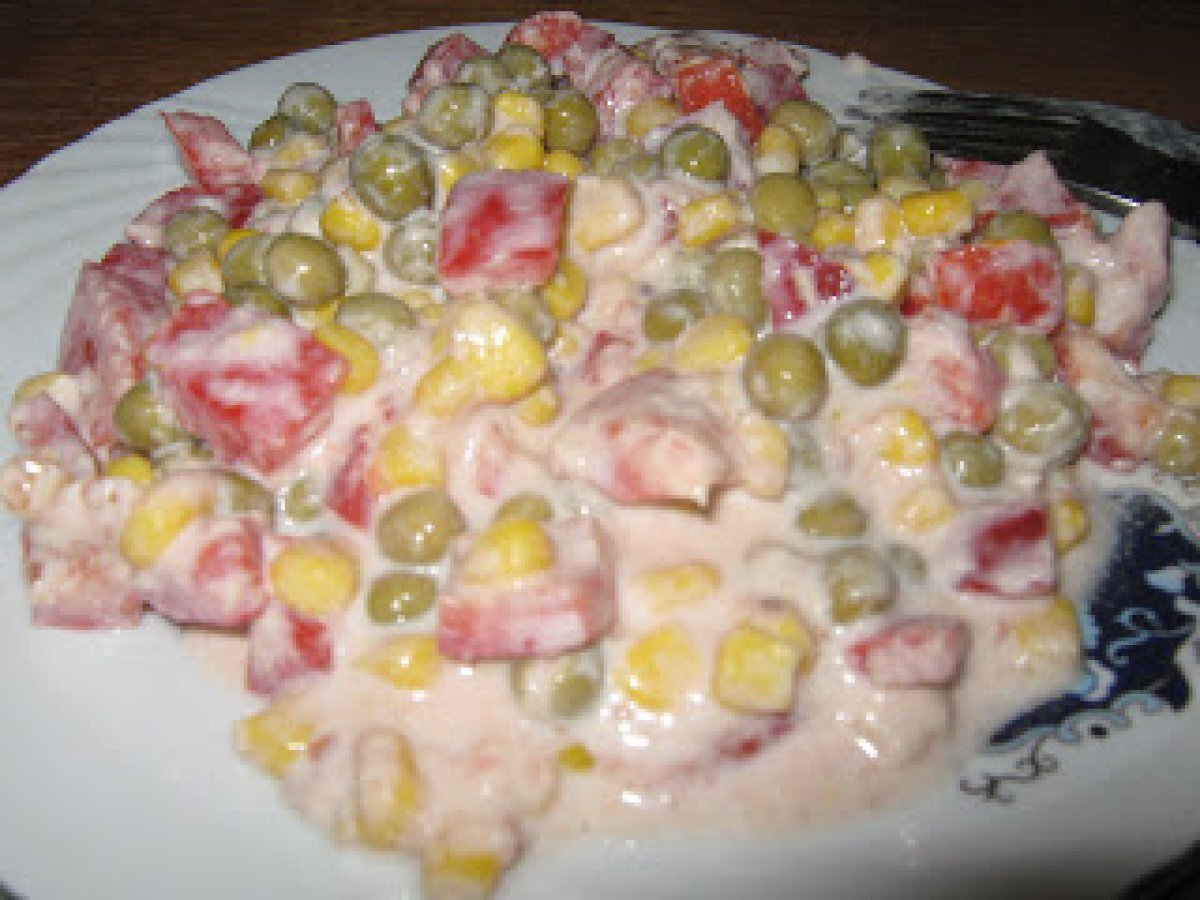 Salata de ton cu smantana AntreuriFoarte ușor35 min Trimite unui prieten Printează pagina Adresează o întrebare autorului Postează o poză cu rețeta gătită de tine Ingrediente 4 2 rosii, 1 gogosar mai mare, 1 conserva ton in ulei, 1 conserva porumb, 1 conserva mazare, smantana cat va place eu am pus 4 linguri si a fost suficient.