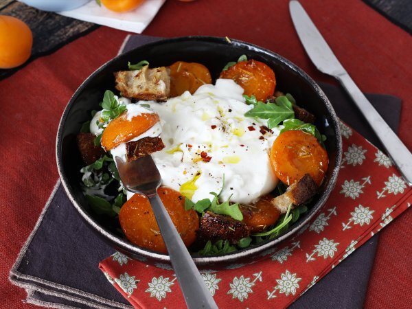 Salată de vară cu caise prăjite, rucola și burrata
