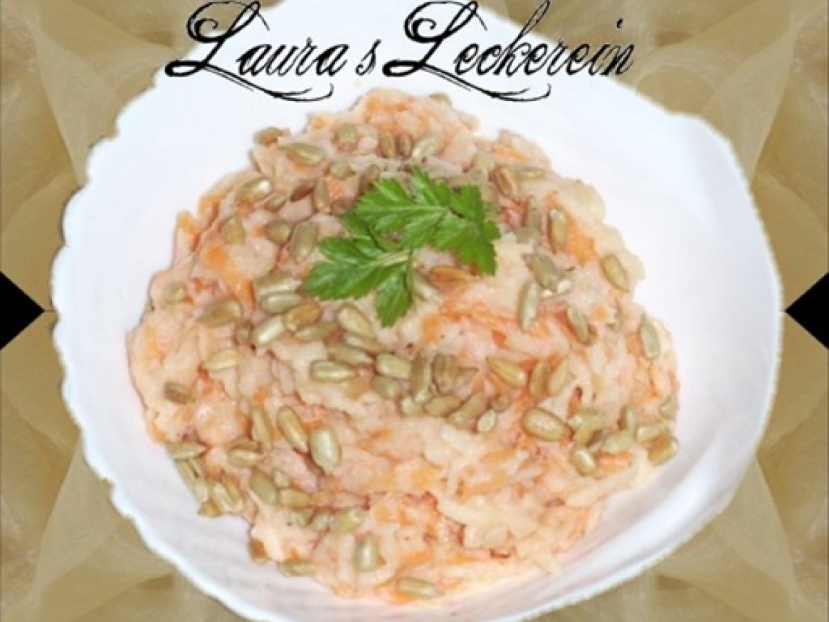 Salata din mere si morcov AntreuriFoarte ușor35 min Trimite unui prieten Printează pagina Adresează o întrebare autorului Postează o poză cu rețeta gătită de tine Ingrediente 4 5 morcovi mari 5 mere mari zeama de la 1 lamiie mare sau 2 mici 1ls zahar 100 g iaurt 2-3ls maioneza sare + piper seminte prajite