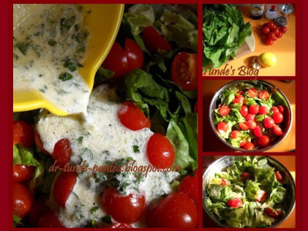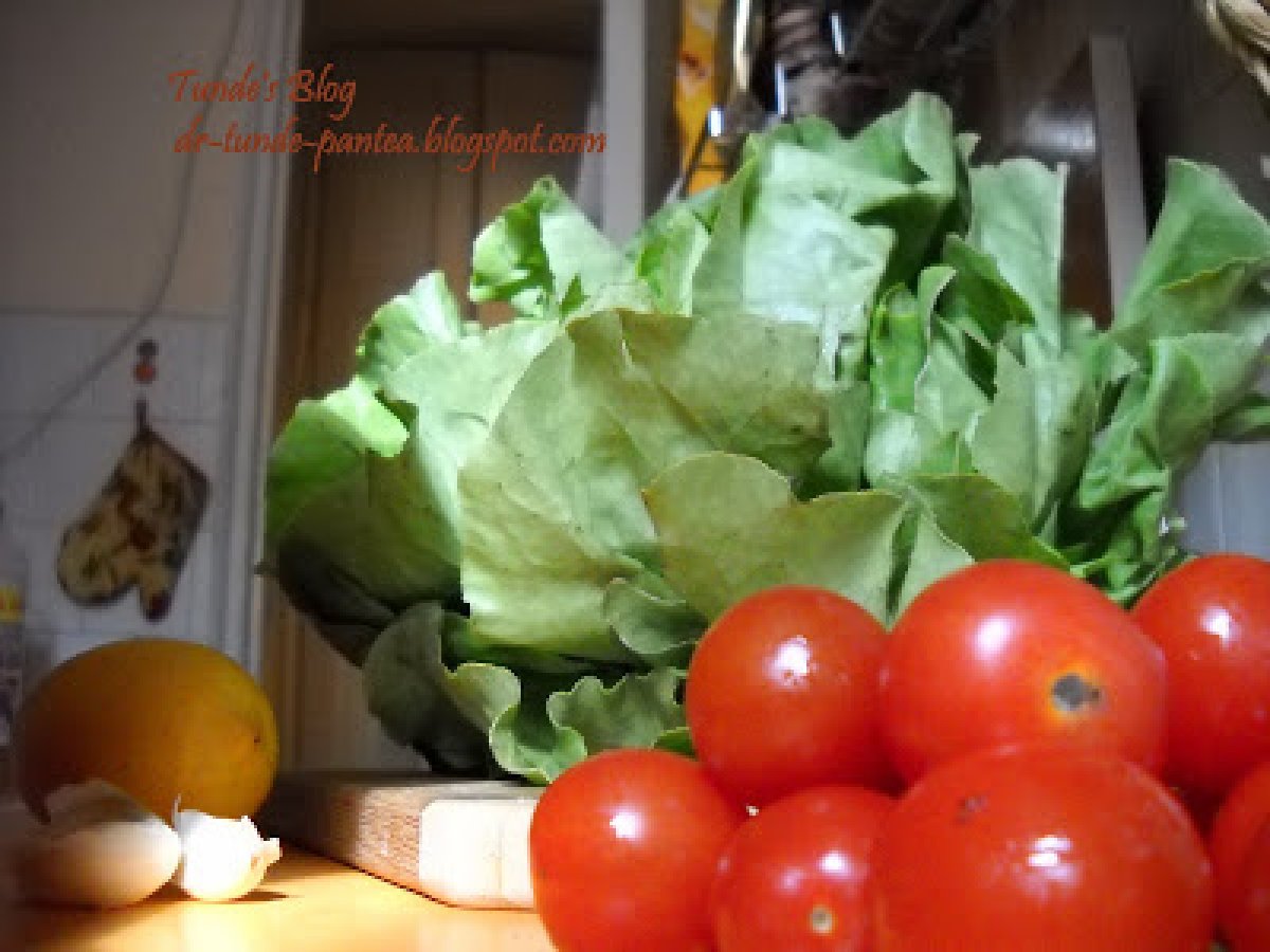 Salata din salata verde si rosii cherry PrecedentulUrmătorul AntreuriFoarte ușor30 min Trimite unui prieten Printează pagina Adresează o întrebare autorului Postează o poză cu rețeta gătită de tine Ingrediente 6 300 g rosii cherry o salata verde mare o lamaie 2 catei de usturoi o lingura de iaurt sare piper ulei de masline o legatura de patrunjel verde