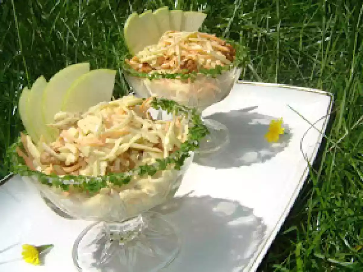 Salata festiva de cruditati PrecedentulUrmătorul AntreuriFoarte ușor30 min Trimite unui prieten Printează pagina Adresează o întrebare autorului Postează o poză cu rețeta gătită de tine Ingrediente 4 2 morcovi o telina 3 mere o mina de miez de nuca maioneza usoara sare si piper