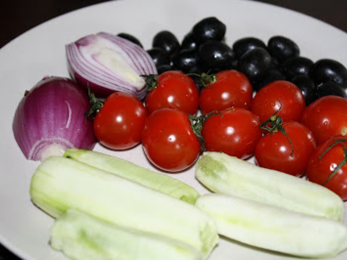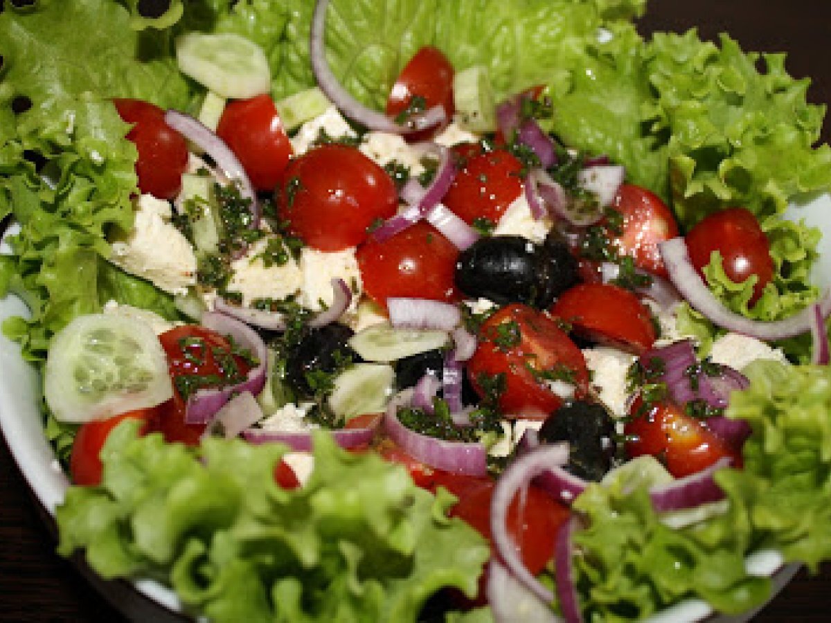 Salata greceasca PrecedentulUrmătorul AntreuriFoarte ușor20 min Trimite unui prieten Printează pagina Adresează o întrebare autorului Postează o poză cu rețeta gătită de tine Ingrediente 2 rosioare cherry o ceapa rosie castraveti masline branza feta sau telemea salata verde ( fac) dressing : ulei de masline zeama de lime sare, piper busuioc