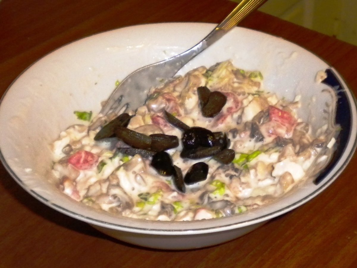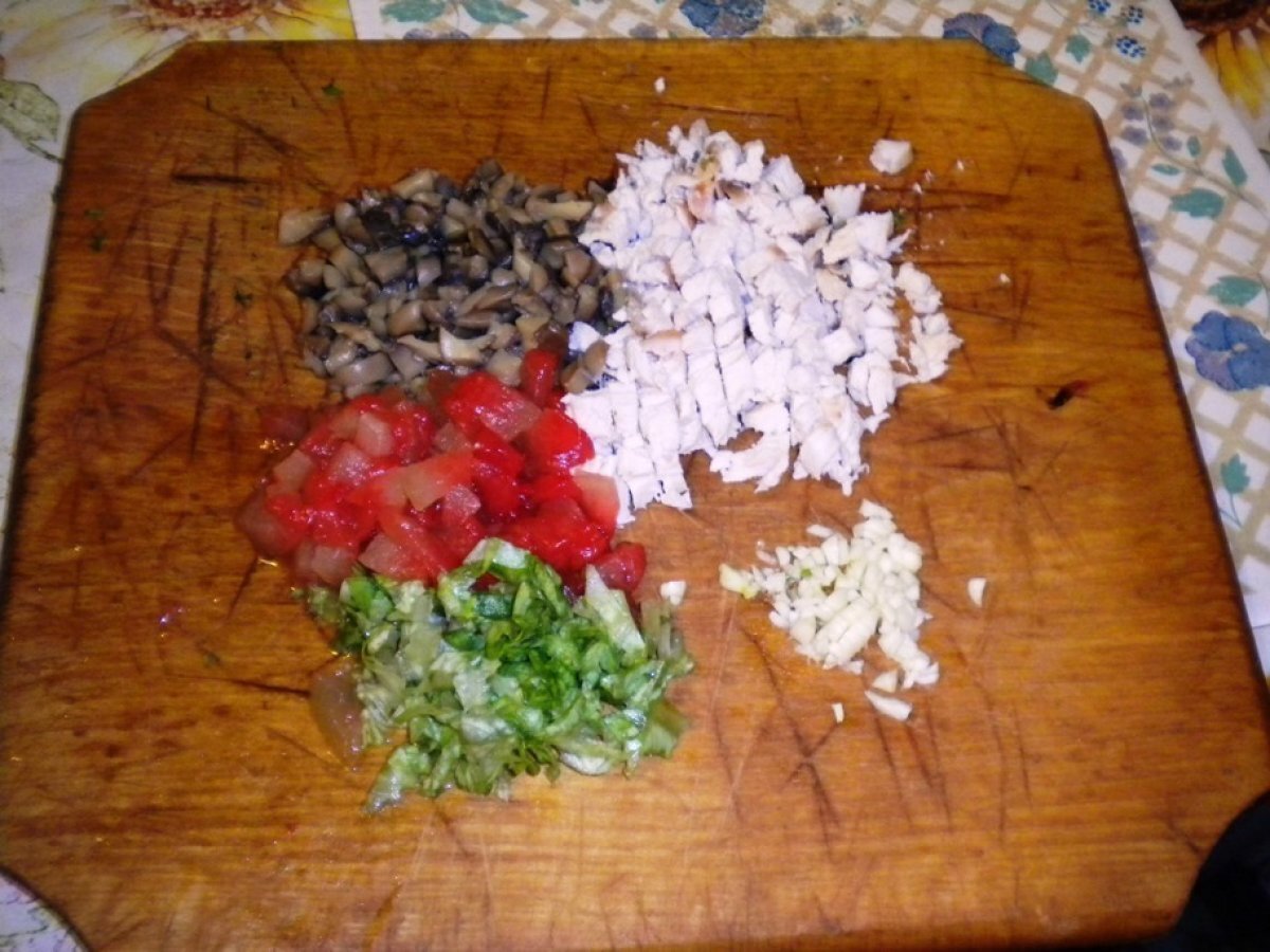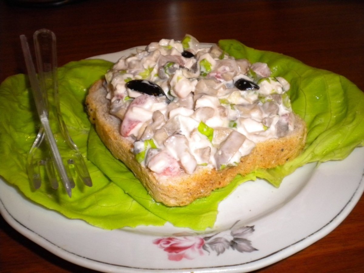 Salata laguna PrecedentulUrmătorul AntreuriFoarte ușor35 min Trimite unui prieten Printează pagina Adresează o întrebare autorului Postează o poză cu rețeta gătită de tine Ingrediente 1 70g de piept de pui fript, 2 castraveti murati (eu am folosit pepene, dar e mai gustos cu castraveti), 3-4 linguri de ciuperci din conserva, 2 linguri de maioneza, 5-6 masline mari, cateva foi de salata verde, zeama de la jumatate de lamaie, usturoi dupa gust (optional).