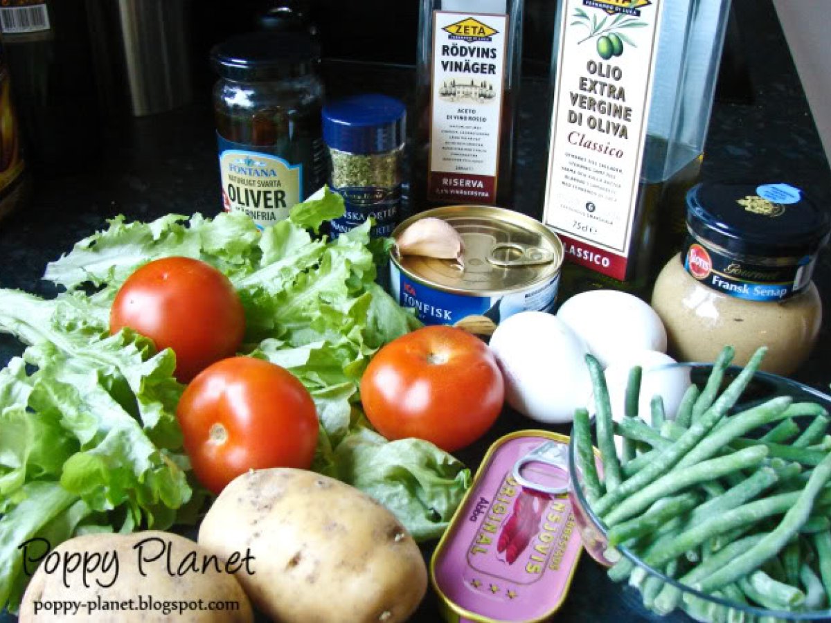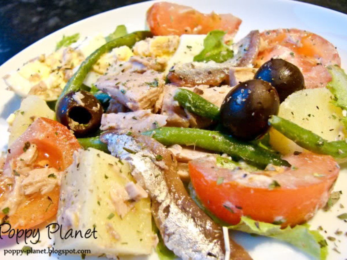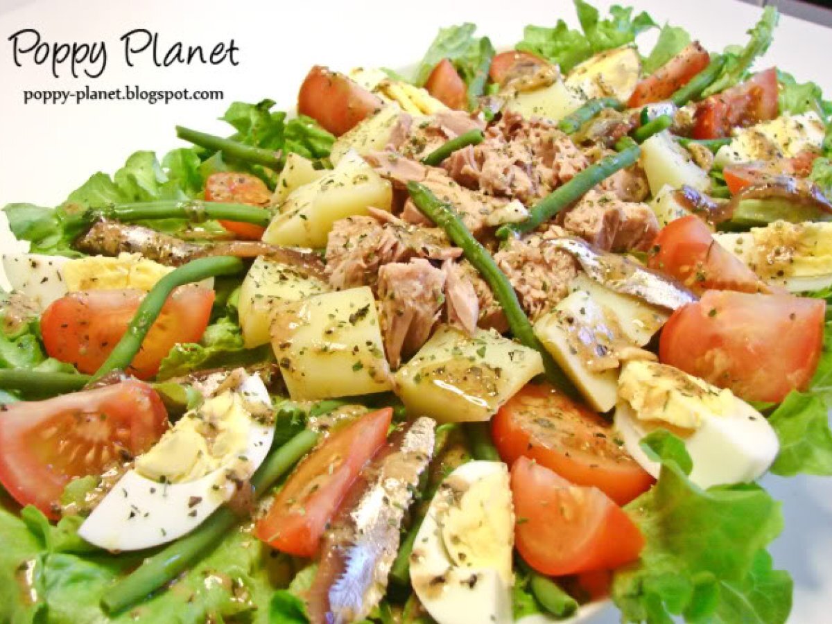 Salata niçoise PrecedentulUrmătorul AntreuriFoarte ușor30 min Trimite unui prieten Printează pagina Adresează o întrebare autorului Postează o poză cu rețeta gătită de tine Ingrediente 4 oua fierte cartofi fierti rosii salata verde fileuri ansoa (o conserva mica) ton, o conserva masline negre pastai fierte Pentru vinegreta: ulei de masline otet mustar de Dijon un catel de usturoi ierburi aromate (rozmarin, maghiran, cimbru, patrunjel, oregano, busuioc, tarhon) sare