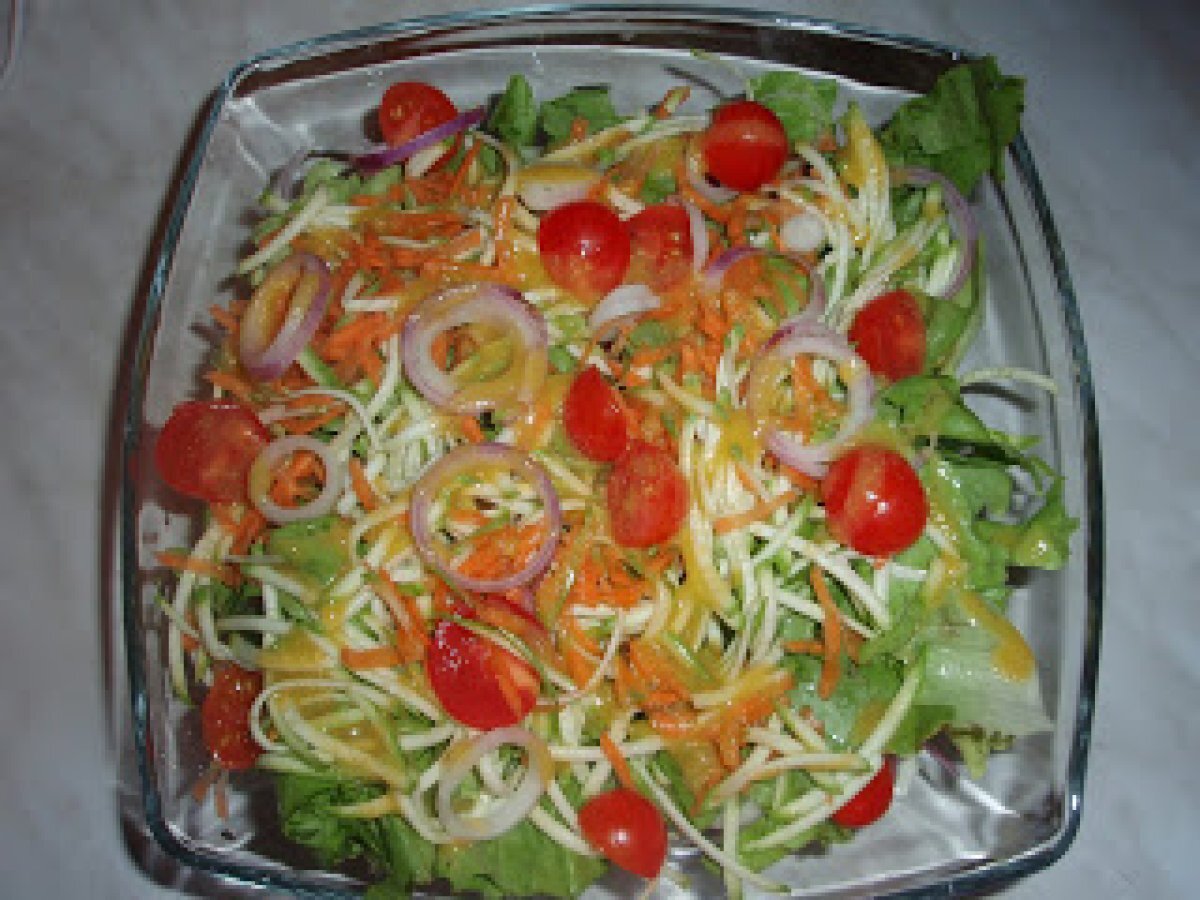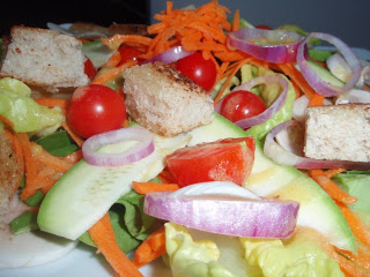 Salata romana PrecedentulUrmătorul AntreuriFoarte ușor45 min Trimite unui prieten Printează pagina Adresează o întrebare autorului Postează o poză cu rețeta gătită de tine Ingrediente 4 o salata verde, mare 2 dovlecei tineri,medii 2 morcovi o ceapa rosie mica 4 rosii /o mana de rosii cherry 1 lingurita mustar de Djion (sau mustarul care va place) 6 linguri ulei de masline 1 lingura otet sare,piper 4 felii de paine 50 g unt/ulei de masline -pentru prajit painea