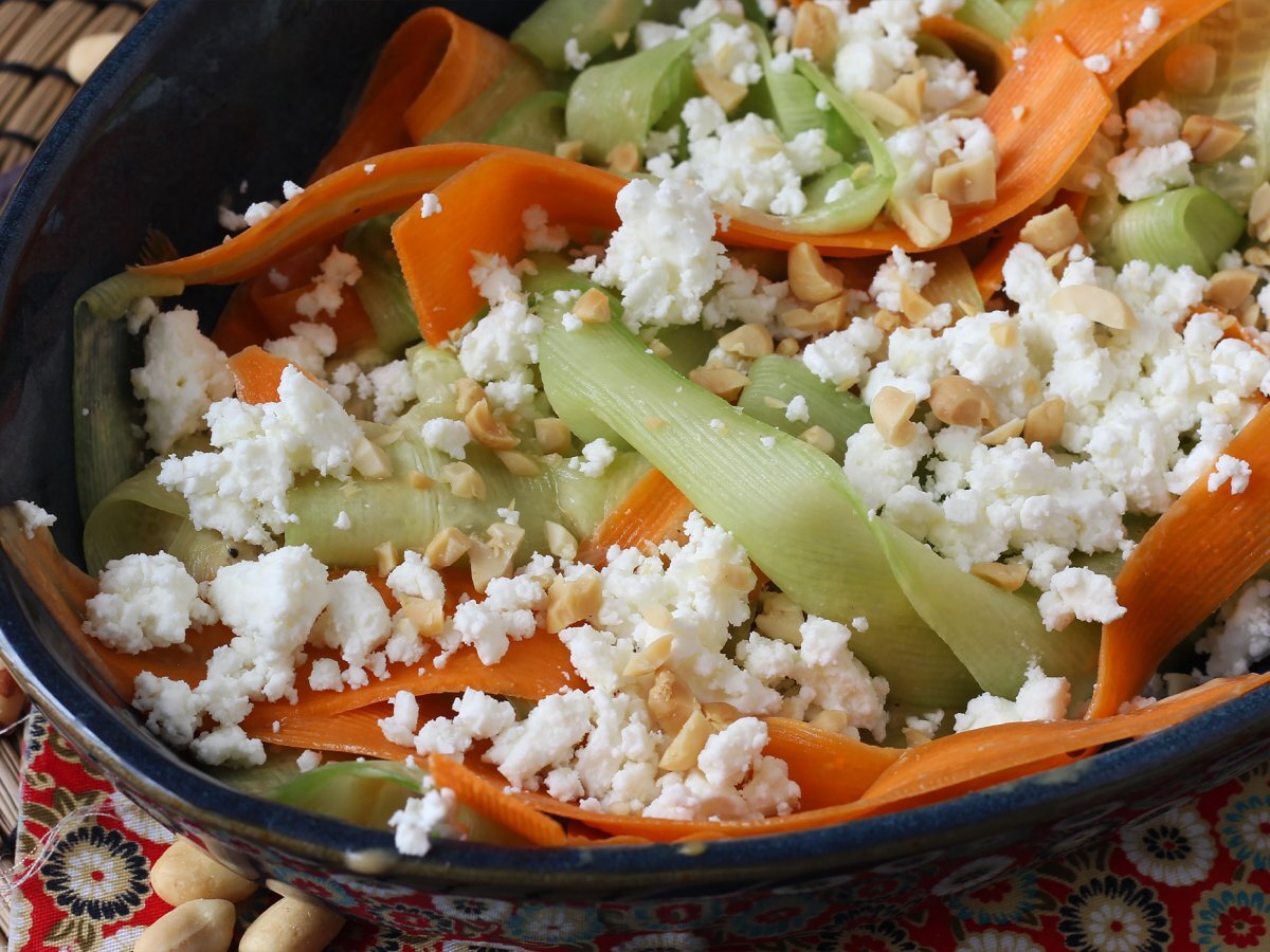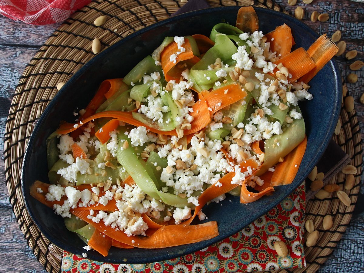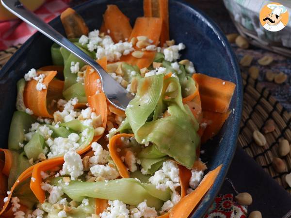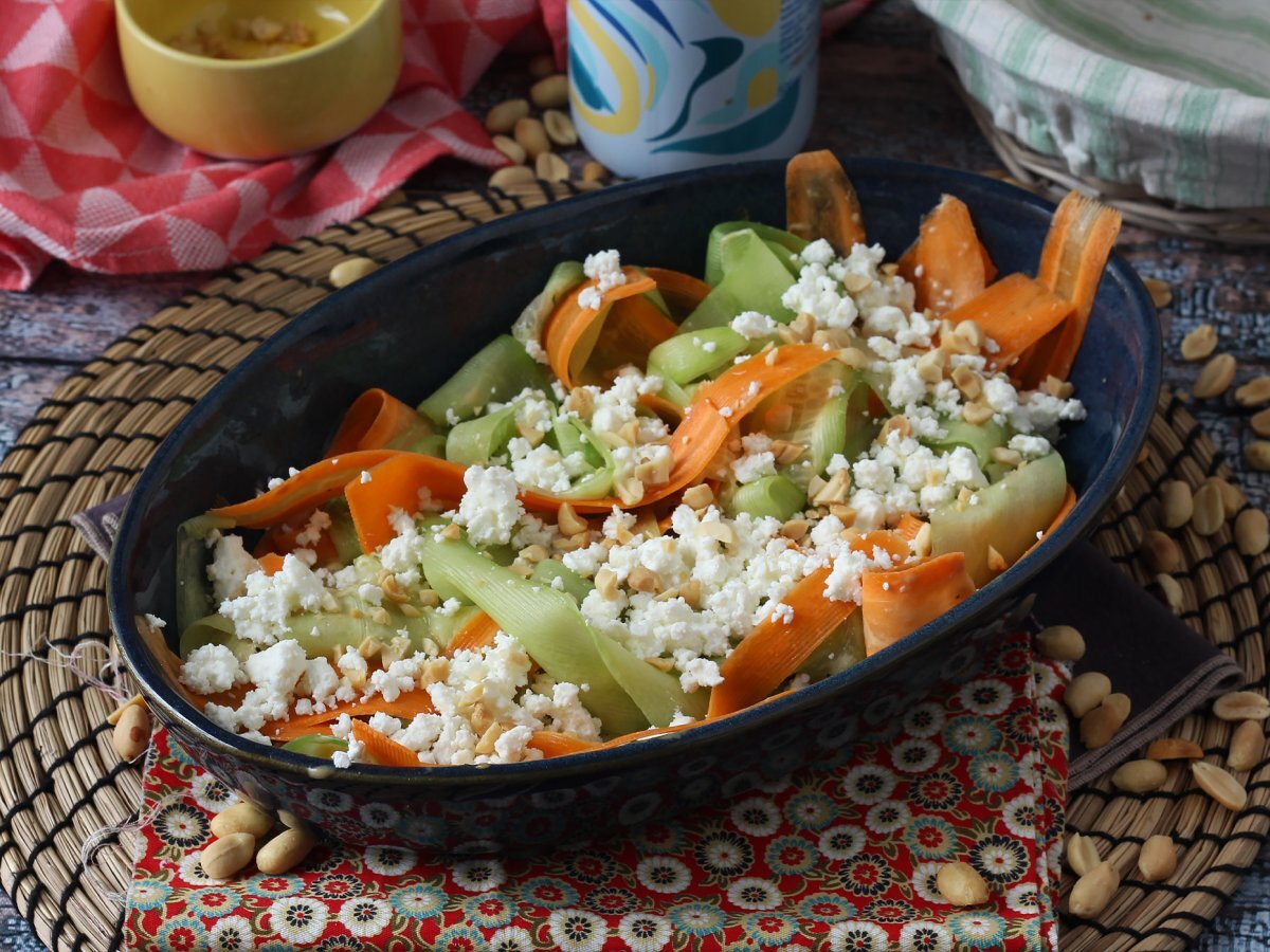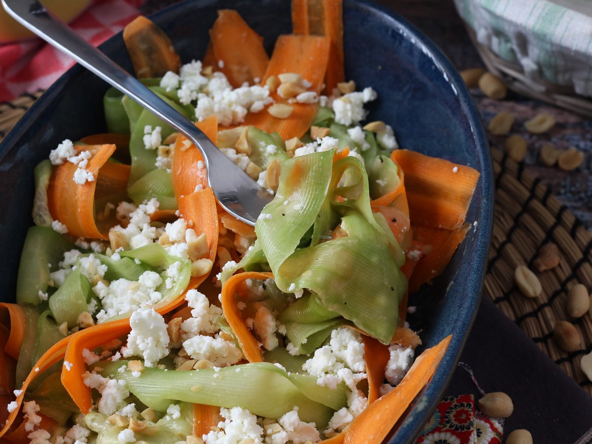 Abia așteptăm să pregătim salate ușoare și delicioase pentru picnicuri și grătare :-) Începem vara cu această salată colorată și crocantă formată din tagliatelle de castraveți și morcovi, toate acoperite cu un sos de arahide. Ușor de preparat, este ideal pentru un prânz ușor, o cină rapidă sau o garnitură originala. Perfect pentru iubitorii de bucătărie sănătoasă, gourmet și vegetarian ;-) Evident, puteți varia legumele în funcție de anotimpuri (dovlecel, ardei etc.).