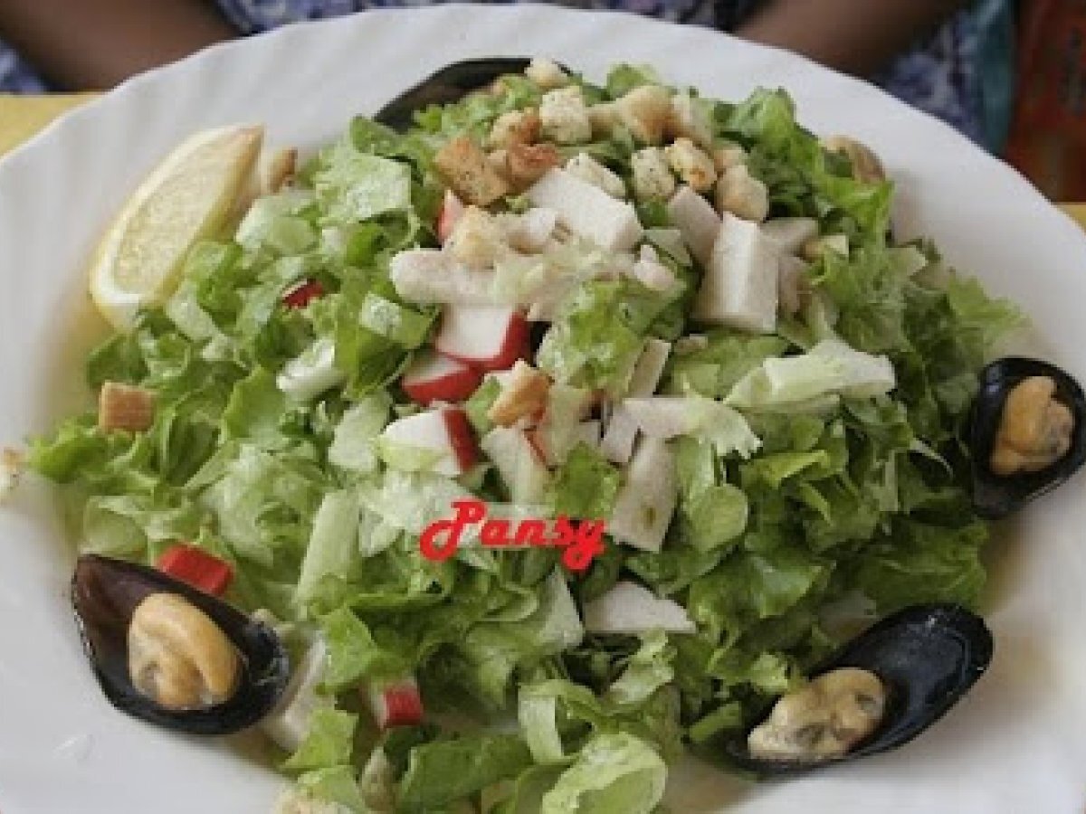 Salata verde cu fructe de mare AntreuriFoarte ușor30 min Trimite unui prieten Printează pagina Adresează o întrebare autorului Postează o poză cu rețeta gătită de tine Ingrediente 4 o salata verde taiata marunt o ceapa tocata si ea marunt un pachetel surimi o ceasca creveti decorticati o mana de midii congelate sau 20 midii in cochilie 3 catei de usturoi tocati patrunjel verde tocat sare,piper sos de soia ulei de masline zeama de lamaie