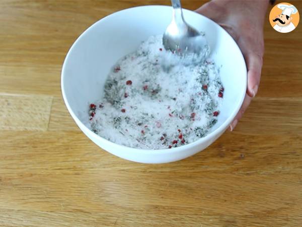 Zdrobiti boabele de piper rosu. Intr-un bol, amestecati zaharul, sarea, boabele de piper rosu zdrobite si mararul tocat.