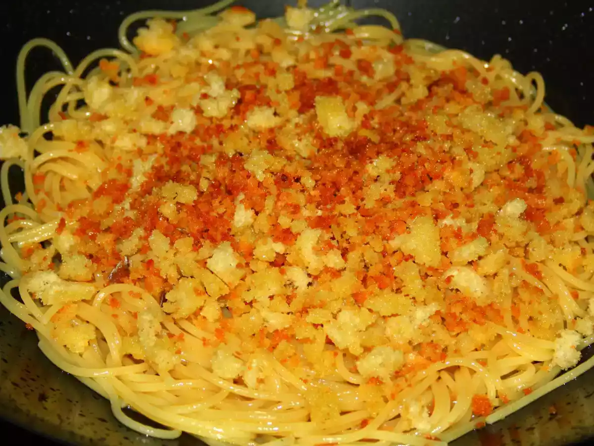 Spaghetti cu ansoa si miez de paine tostat PrecedentulUrmătorul AntreuriFoarte ușor15 min Trimite unui prieten Printează pagina Adresează o întrebare autorului Postează o poză cu rețeta gătită de tine Ingrediente 3 250 g spaghetti 4 file de ansoa 1 ardei mic rosu iute 3 linguri patrunjel 150 g miez de paine ulei de masline 2-3 catei usturoi sare