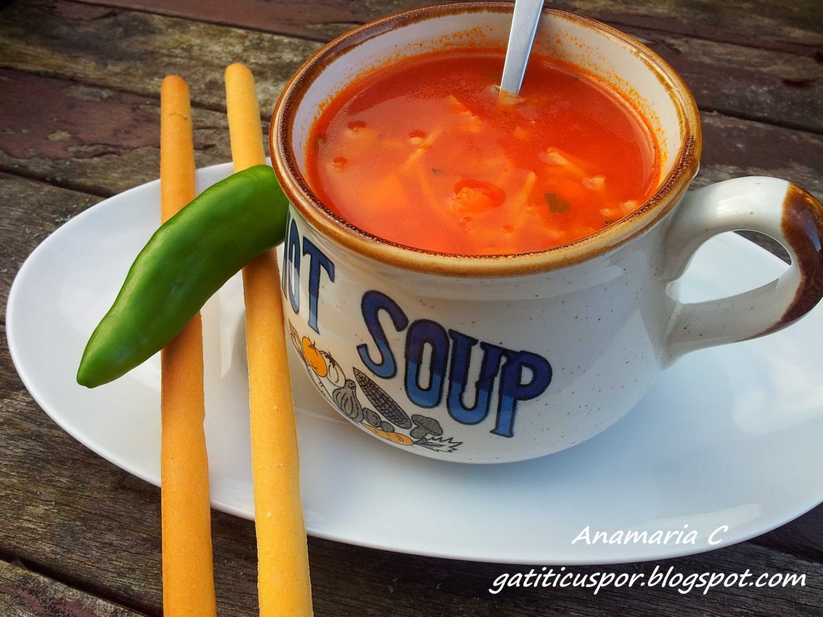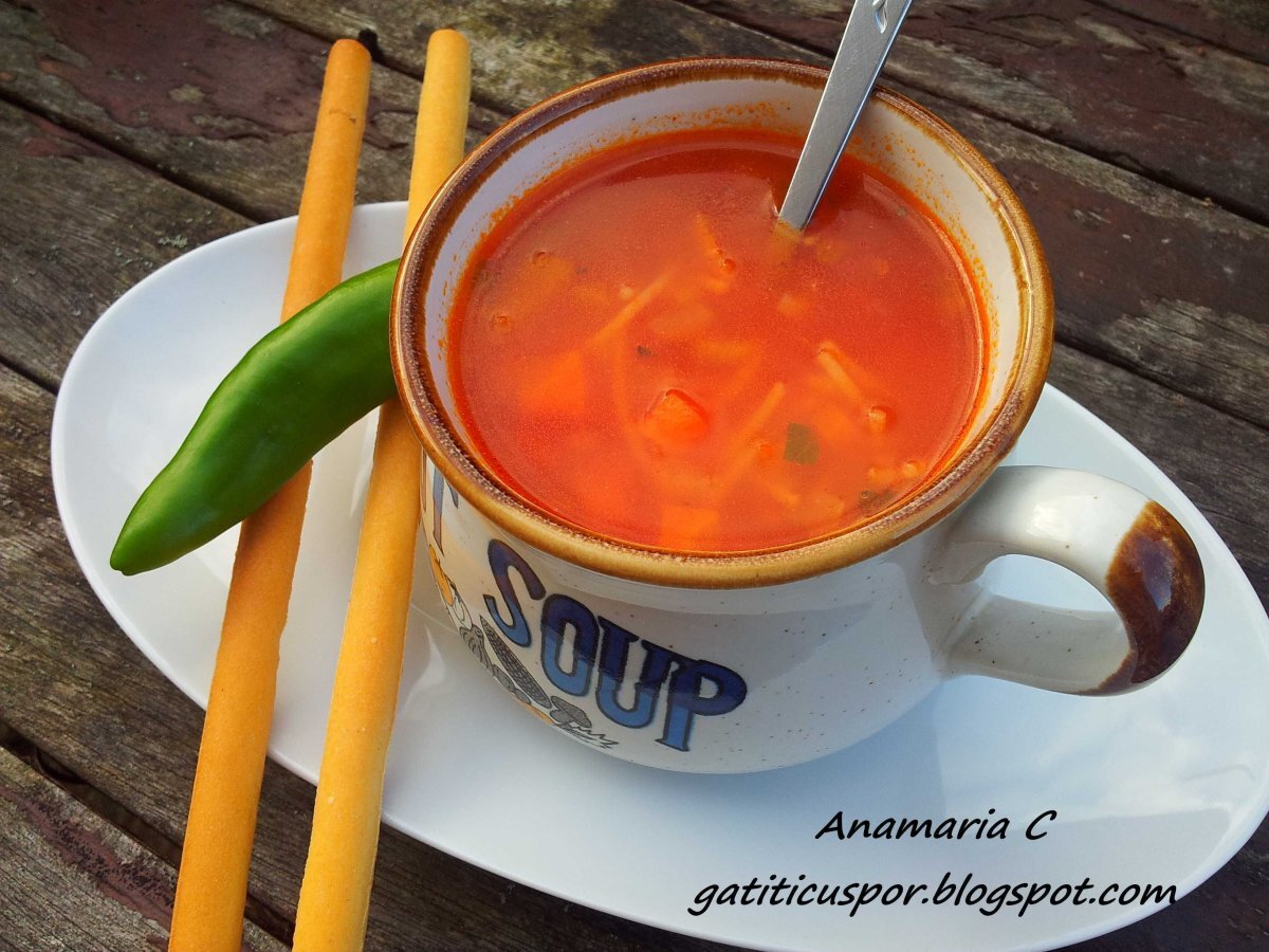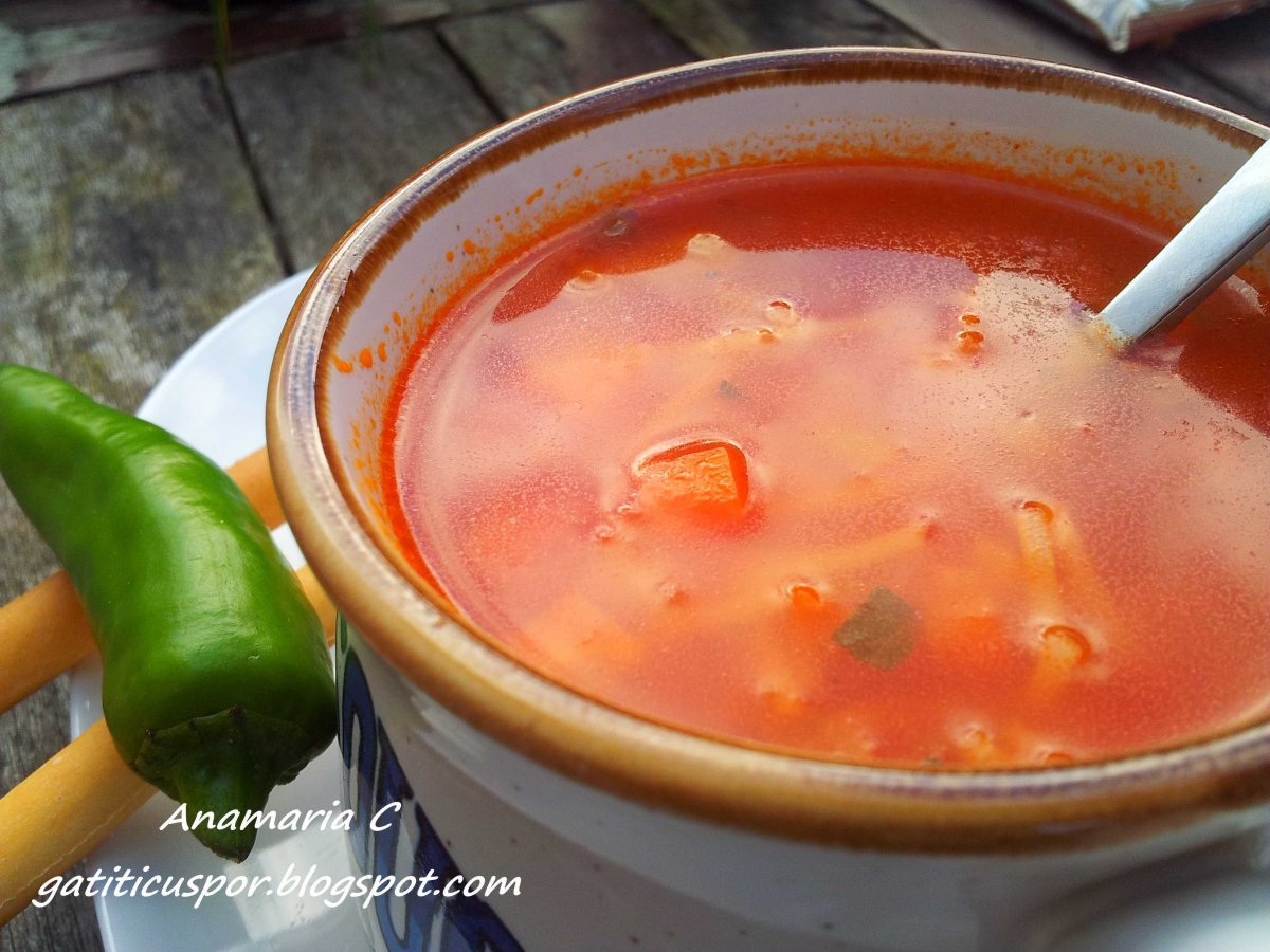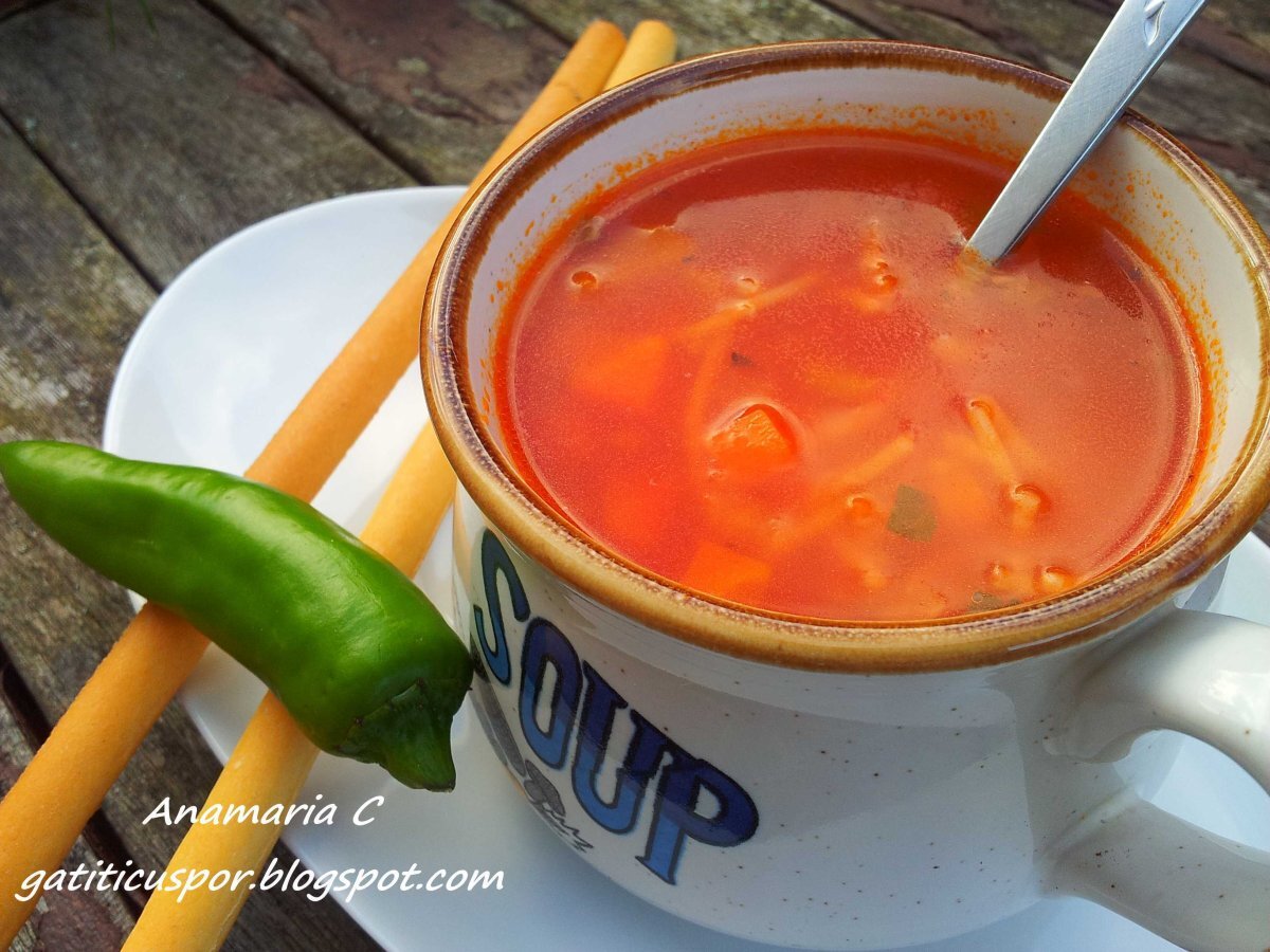 Supa de rosii PrecedentulUrmătorul AntreuriFoarte ușor30 min Trimite unui prieten Printează pagina Adresează o întrebare autorului Postează o poză cu rețeta gătită de tine Va aduc un bol de supa fierbinte de rosii ca doar este frig afara. Ingrediente 8 2 cutii rosii in bulion sau 10 rosii oparite decojite si taiate bucati mici 2 morcovi potriviti 2 tulpini telina un ardei gras o lingurita oregano un cub condiment legume un ardei iute fidea (eu am folosit 4 rotocoale de fidea) patrunjel tocat marunt (dupa gust) sare si piper