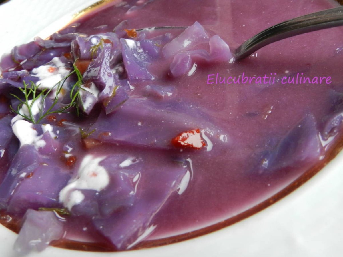 Supă de varză roșie PrecedentulUrmătorul AntreuriFoarte ușor40 min Trimite unui prieten Printează pagina Adresează o întrebare autorului Postează o poză cu rețeta gătită de tine ușoară și foarte hranitoare Ingrediente 8 1/2 varză roșie (aprox. 1 kg), 2 cepe potrivite, 2 morcovi, 1 ardei gras roșu, 300 ml suc de roșii, 1-2 linguri mărar proaspăt tocat, sare, opțional smântână pentru servit.