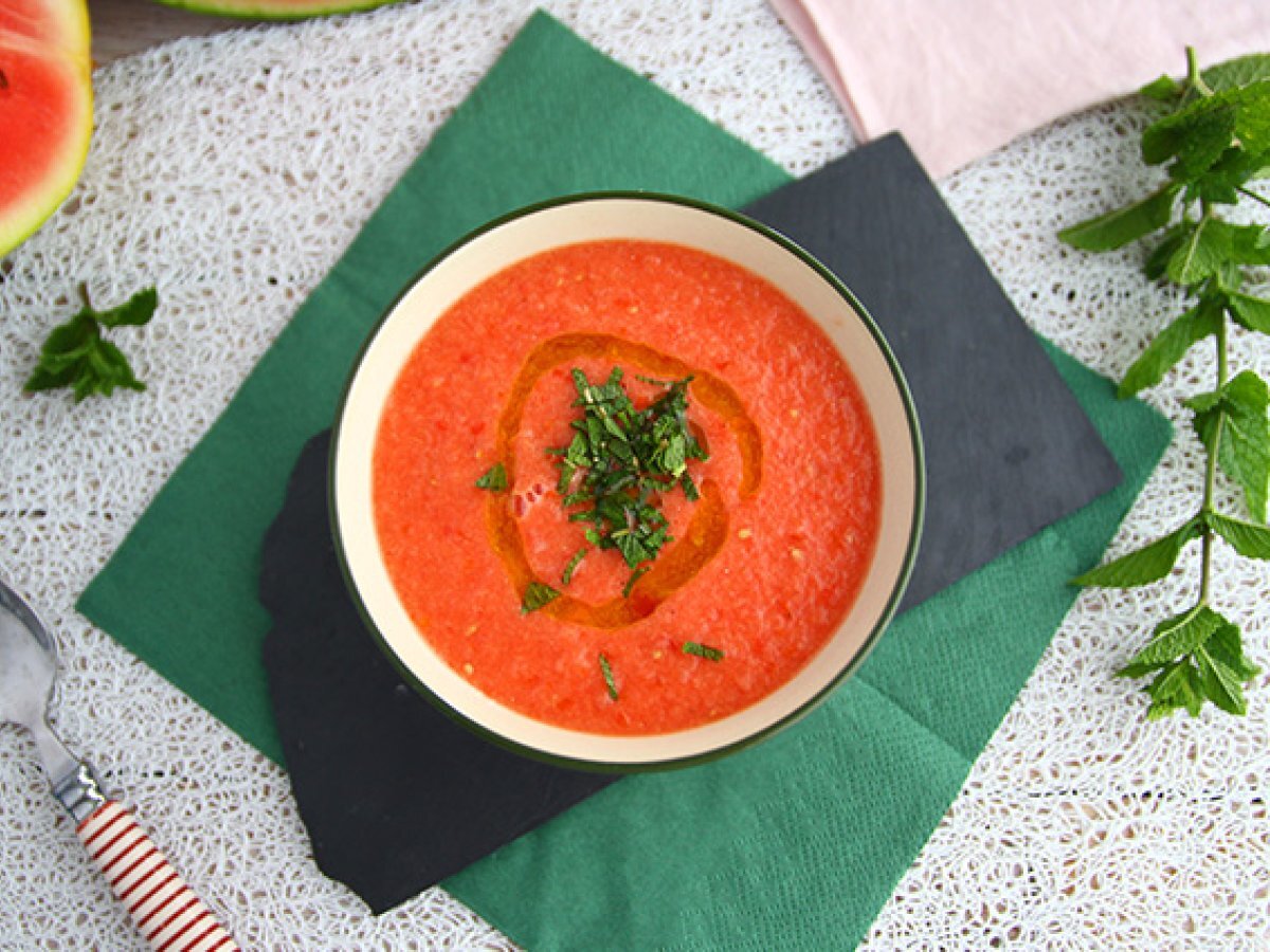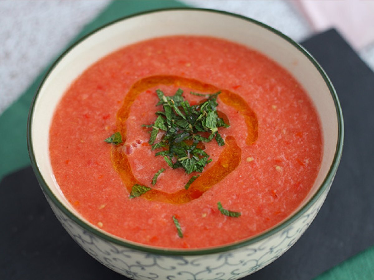 O supa rece pentru a va racori in zilele fierbinti! Astazi va propunem sa amestecati rosiile cu pepene verde si cu un pic de ulei de masline! Pepenele verde va aduce o nota dulce, irezistibila, asa ca lasati-va tentati :-)