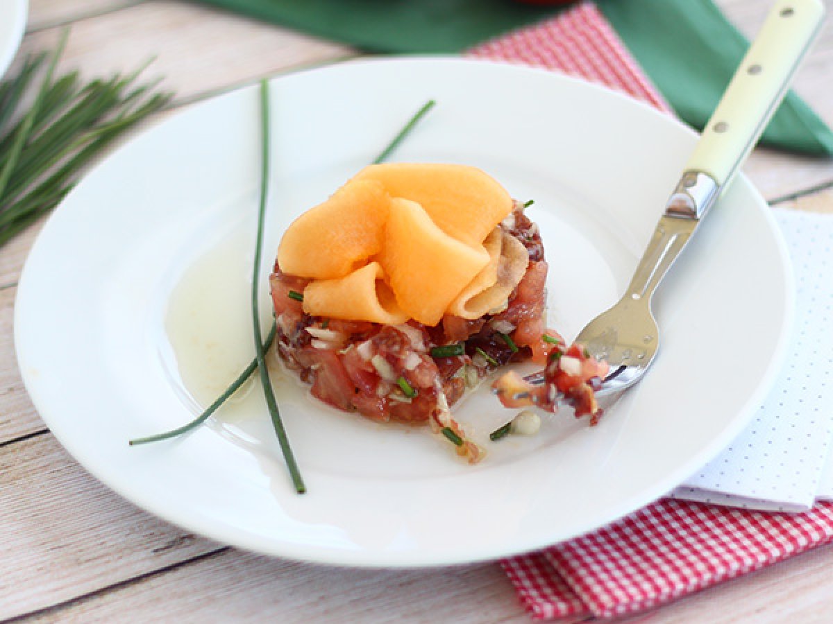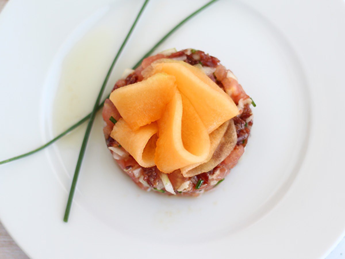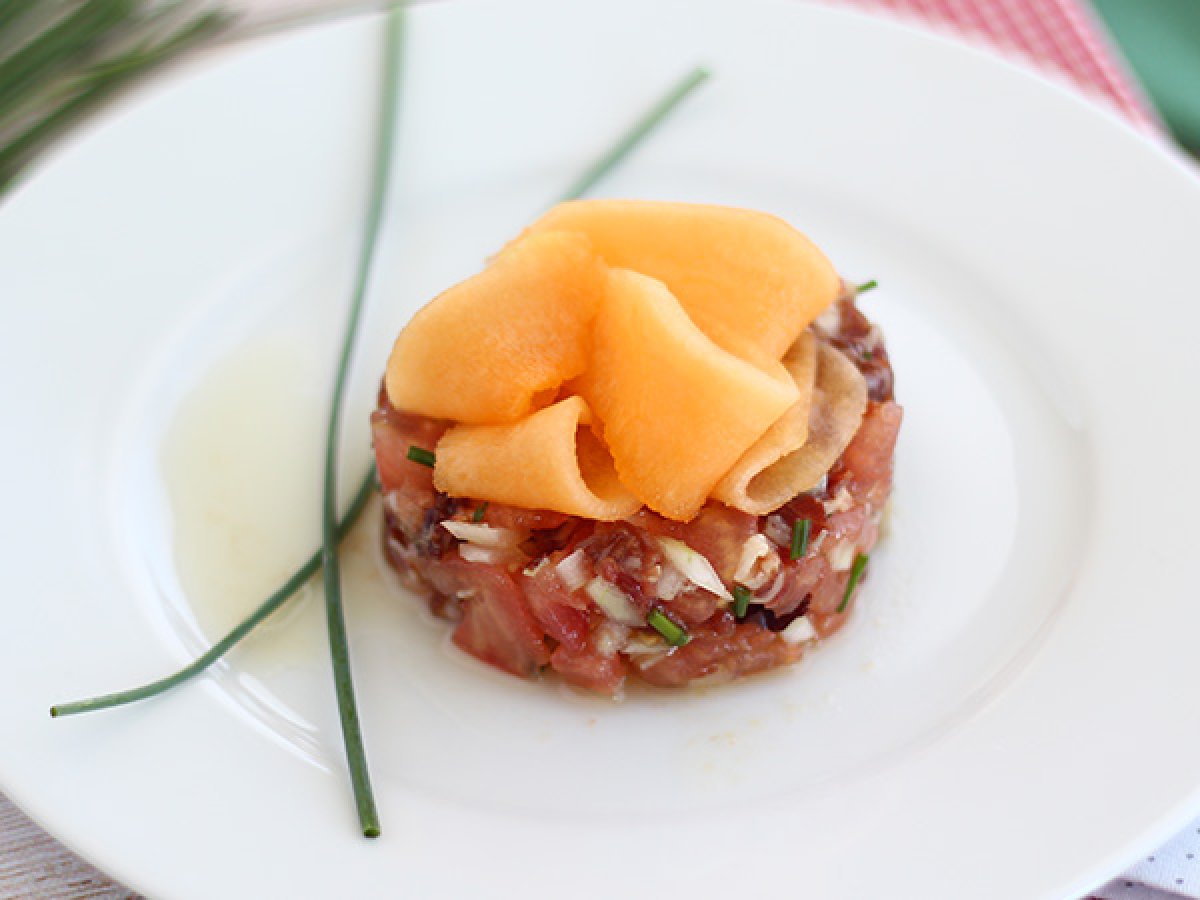 Se taie pepenele galben in felii subtiri si se pune deasupra tartarului.