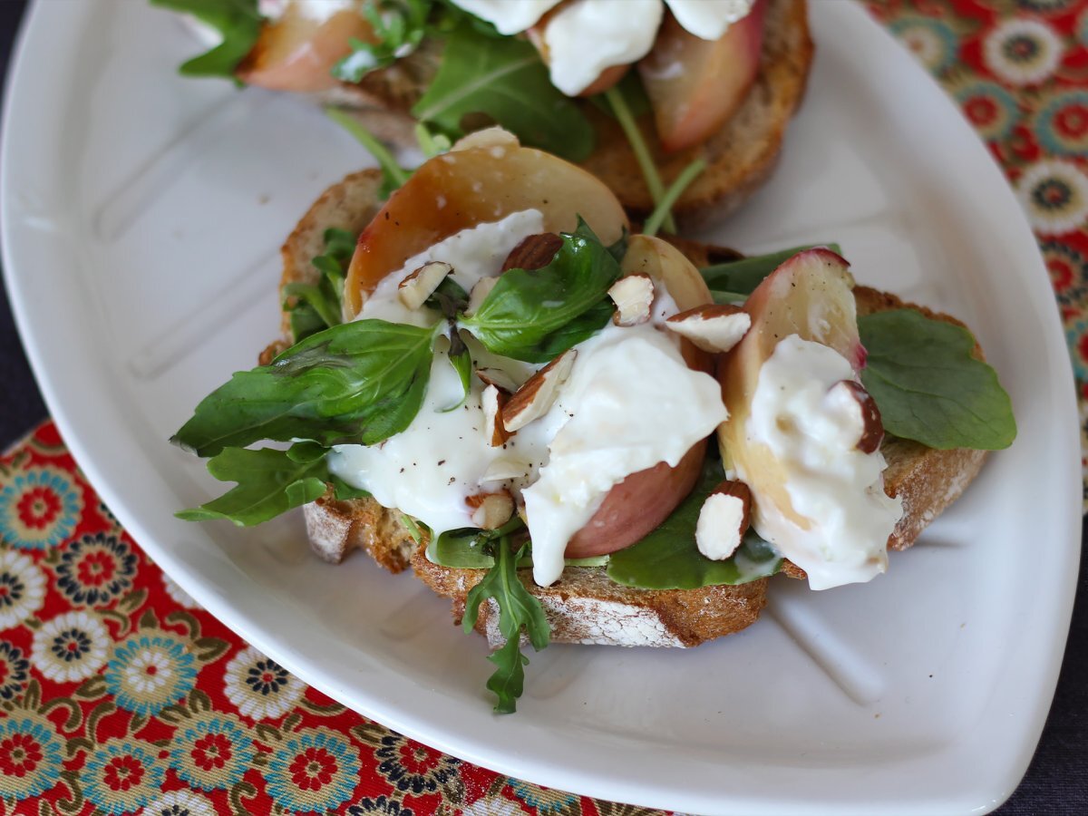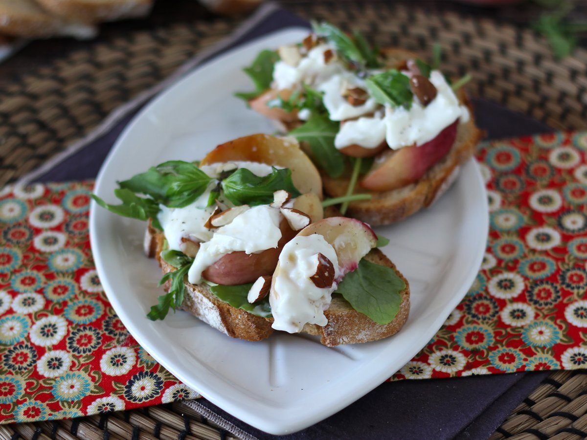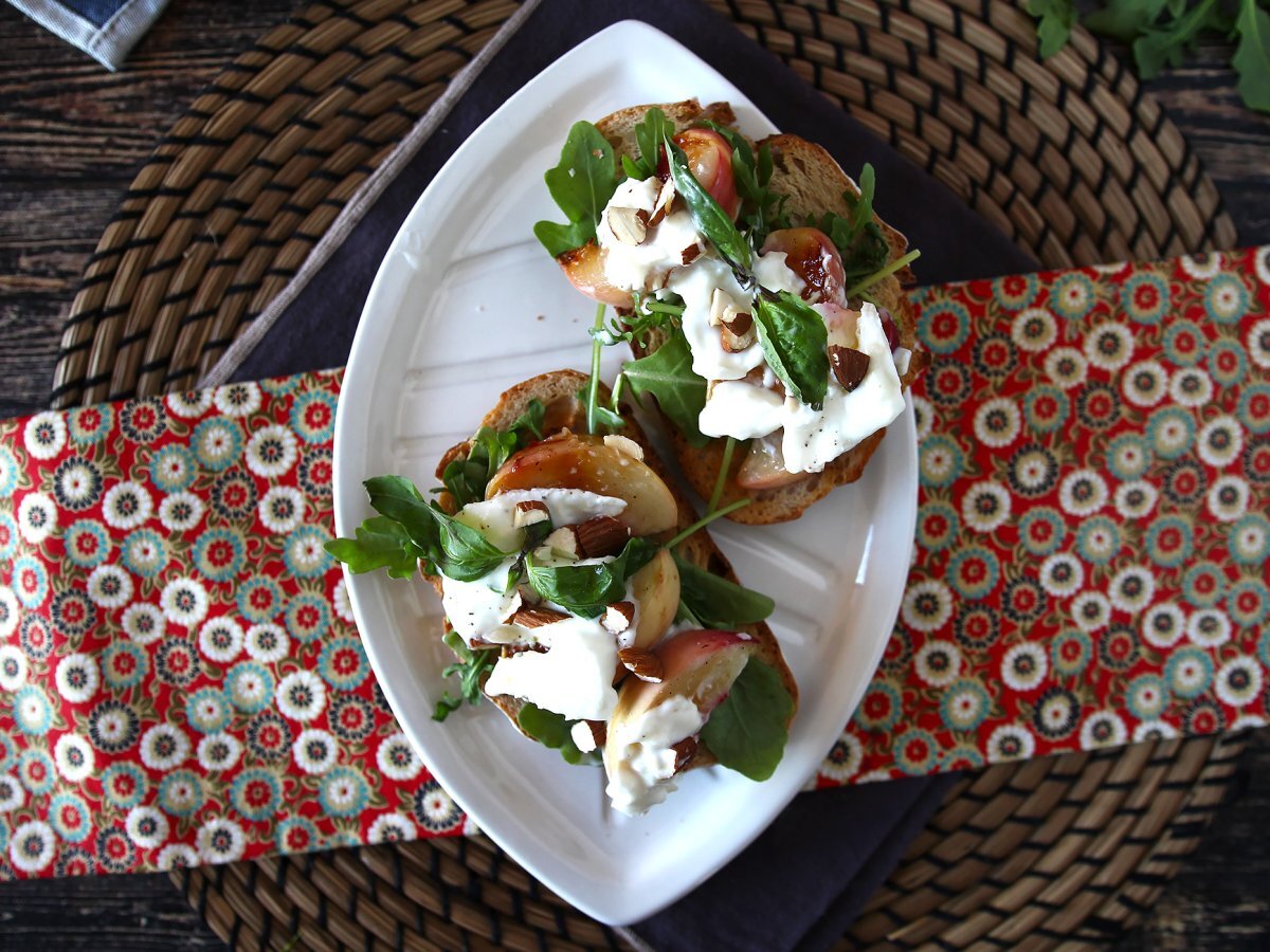 Tartine cu rucola, piersici prăjite si burrata