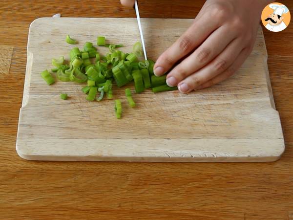 Taiati marunt ceapa verde: veti avea nevoie doar de partea verde. Amestecati amidonul de porumb cu putină apa (aproximativ 1 lingura).