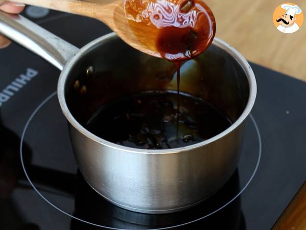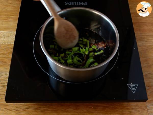 Turnati sosul de soia, apa, zaharul brun si otetul de orez intr-o cratita. Adaugați ceapa verde si catelul de usturoi zdrobit. Se lasa sa se caramelizeze aproximativ 3 - 5 minute la foc mare, amestecand.