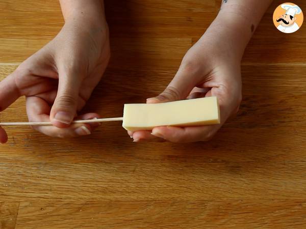 Taiati branza Emmental in 8 bucati dreptunghiulare egale si infigeti frigarui in ele.