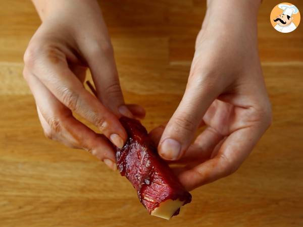 Infasurați feliile de carne de vita marinate in jurul betisoarelor de branza.