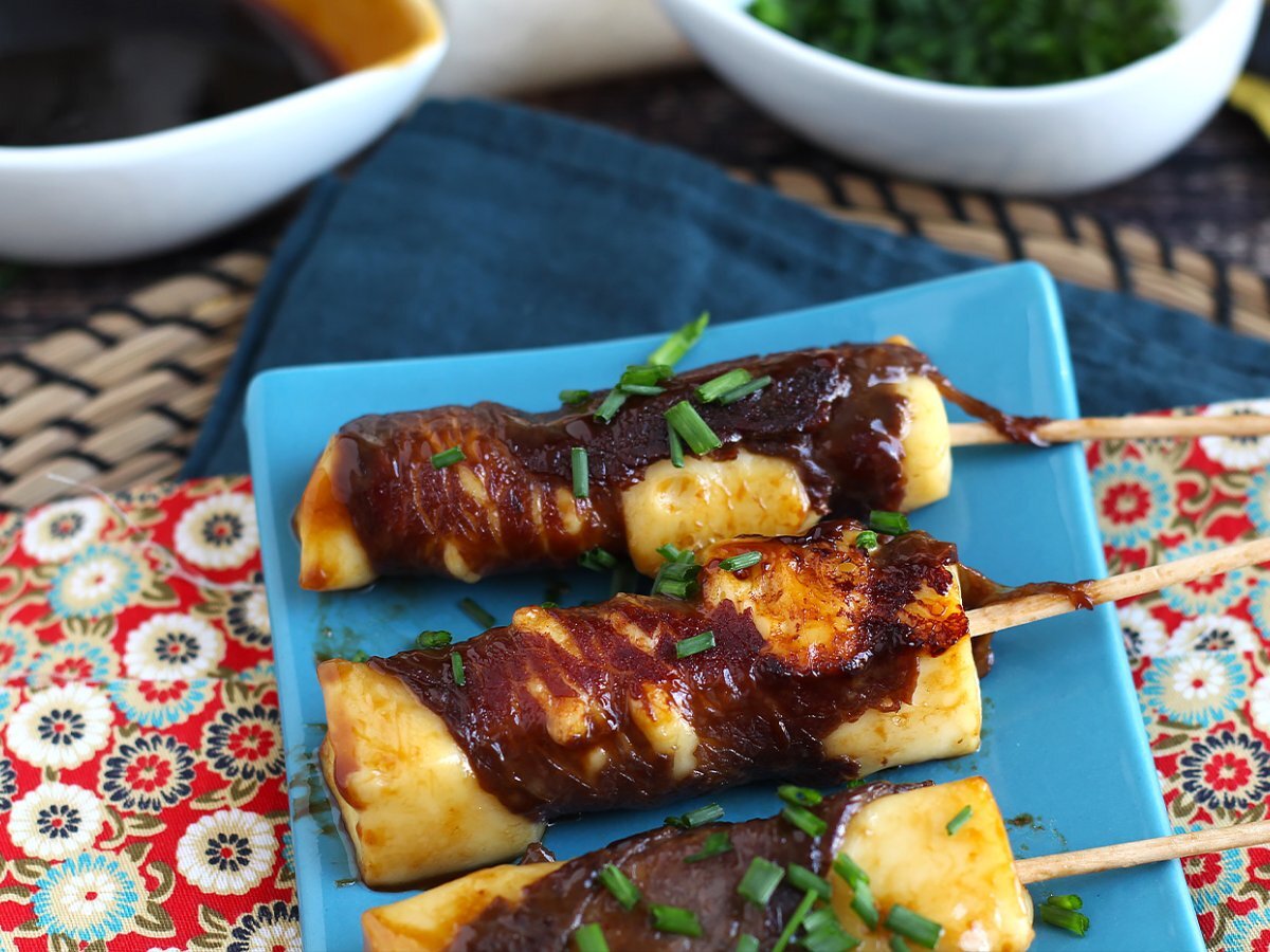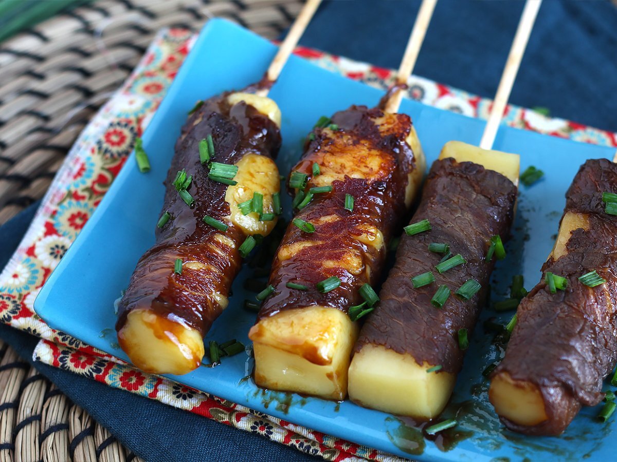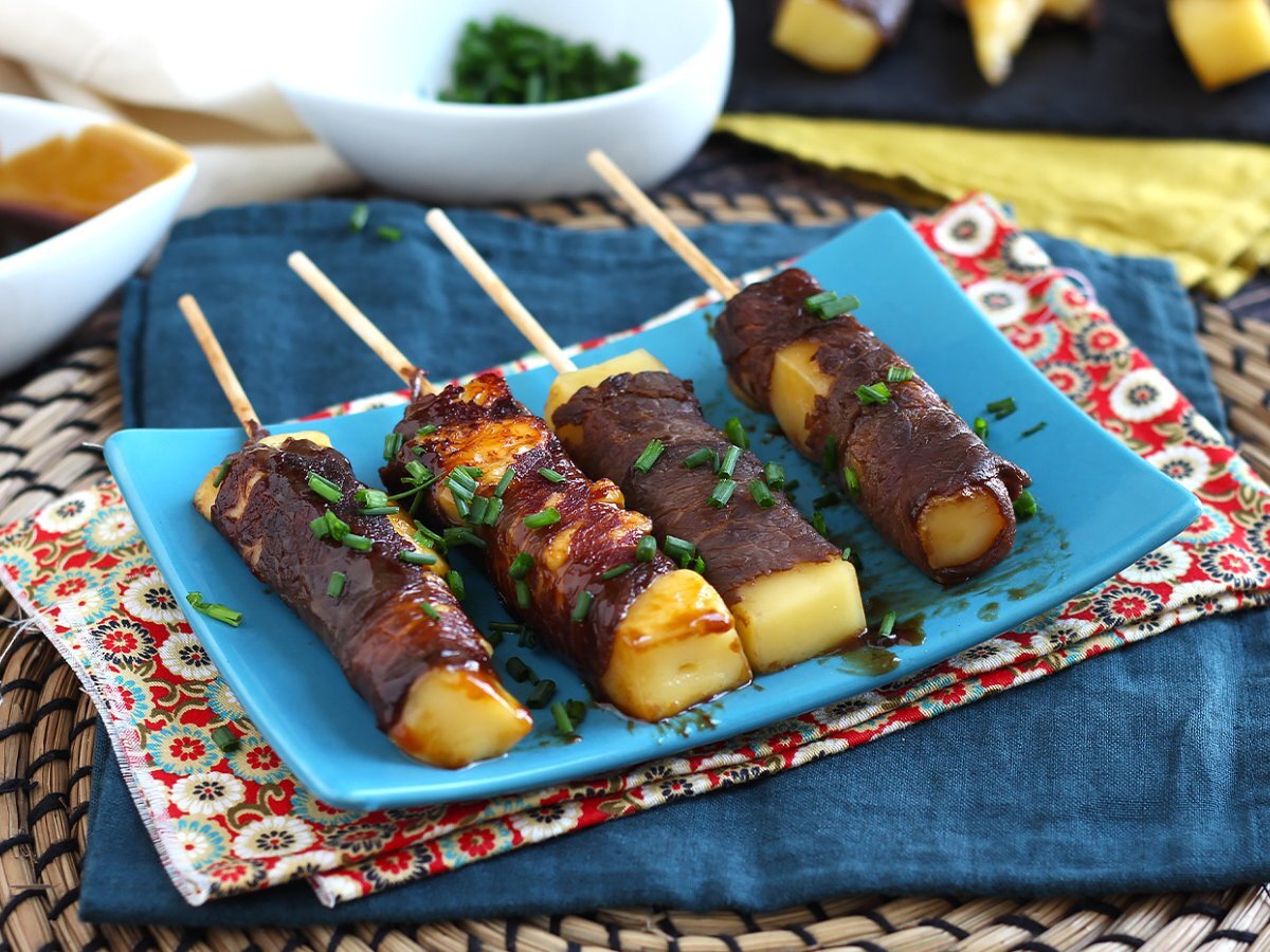 Yakitori! Aceste frigarui japoneze ce combina carnea de vita marinata intr-un sos Yakitori si branza tare. Aceasta reteta este o creatie a restaurantelor japoneze din Franta care stiu cat de mult le place francezilor branza, spre deosebire de japonezi :-)