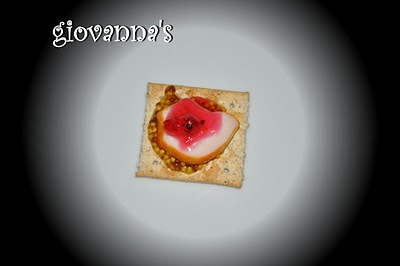 Amestecati intr-un bowl 3 linguri de mustar cu doua linguri de miere de albine. Taiati pieptul de pui afumat bucatele, iar apoi pe un cracker puneti putin mustar cu miere, peste puneti o bucata de piept de pui, iar deasupra putin gem de strugurei rosii.