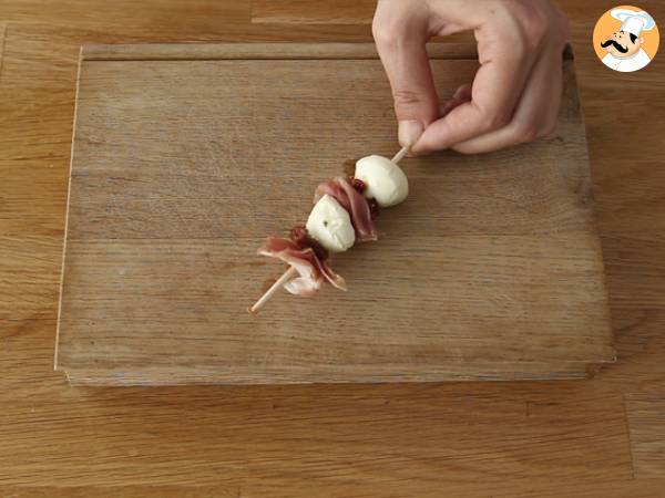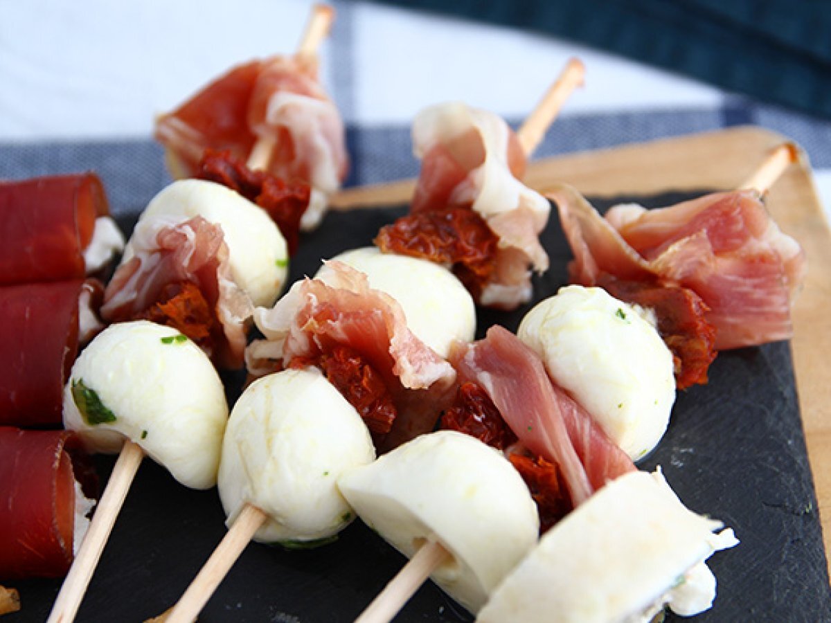 Infigeti cate o bila de mozzarela pe batul de frigarui, adaugati o bucata de prosciutto crudo si o bucata de rosie uscata.