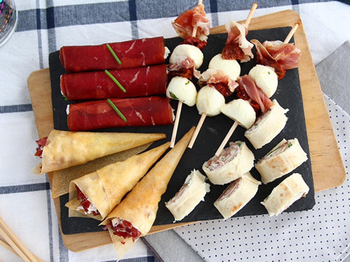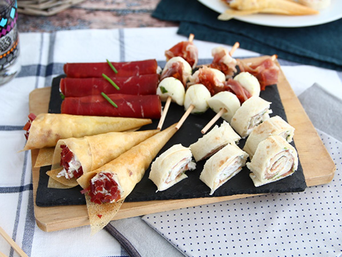 Va prezentam 4 retete cu carne uscata, extrem de usor de facut. Utilizati carne uscata, uneori prosciutto crudo pentru a aduce o nota putin sarata care va face diferenta in acest aperitiv. 3 retete vor fi fara coacere: vom face impachetari, frigarui si rulouri. In cele din urma, foaia de brick va fi gatita sub forma unui con insotit de o umplutura de branza proaspata :-) Urmati pas cu pas etapele de realizare a acestor 4 retete festive si nu ezitați sa ne spuneți intr-un comentariu care este favorita dvs. :-)