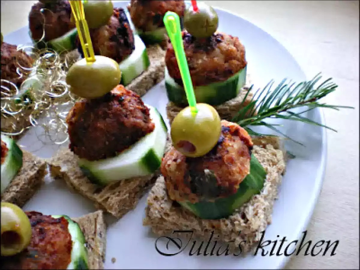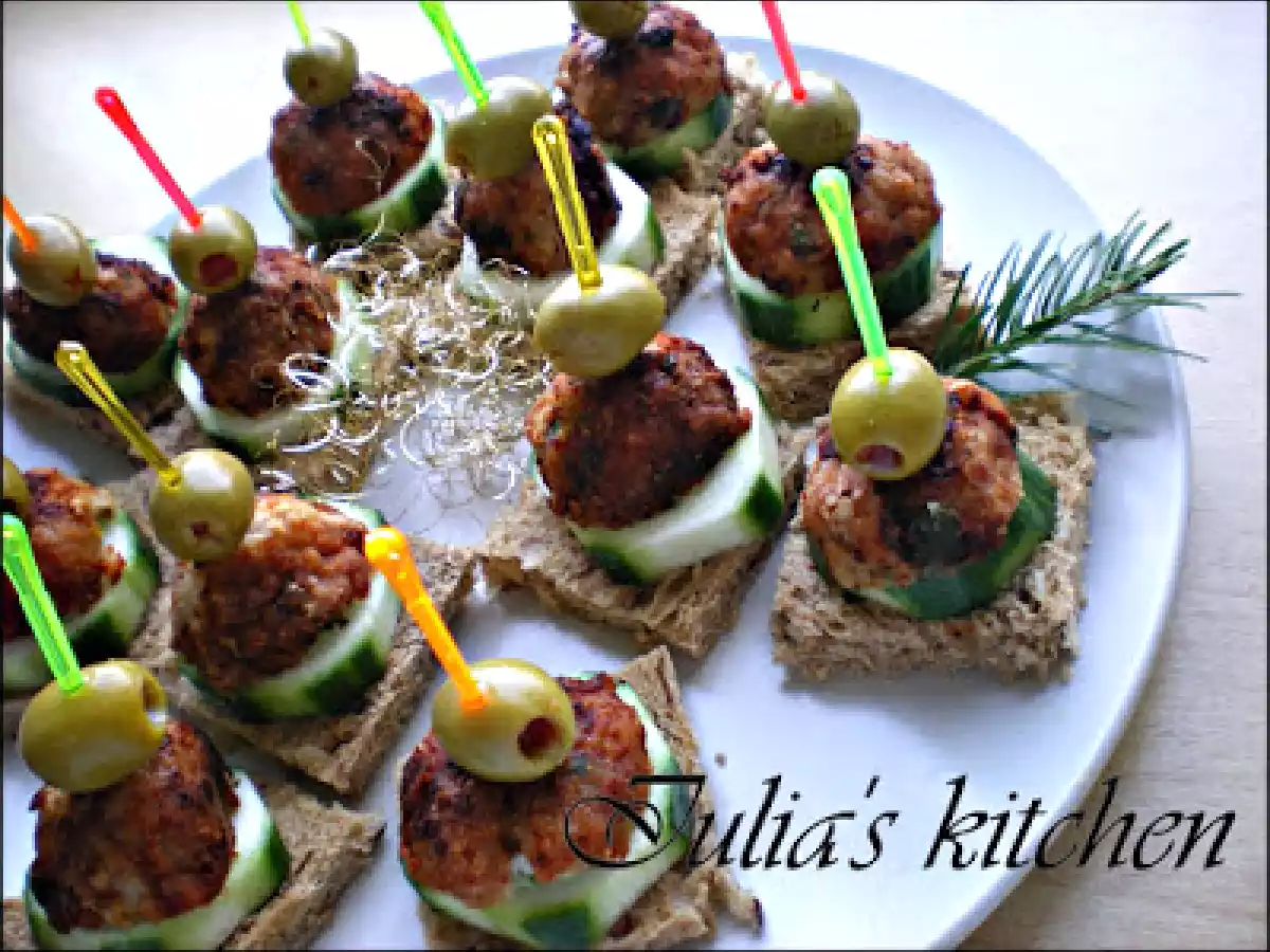- Facem chiftelutele de curcan ca AICI apoi le taiem in jumatati. Inlaturam cu un cutit coaja feliilor de paine, apoi taiem fiecare felie in 4 bucatele mai mici si le ornam ca in poze.
