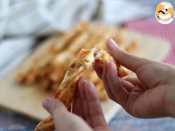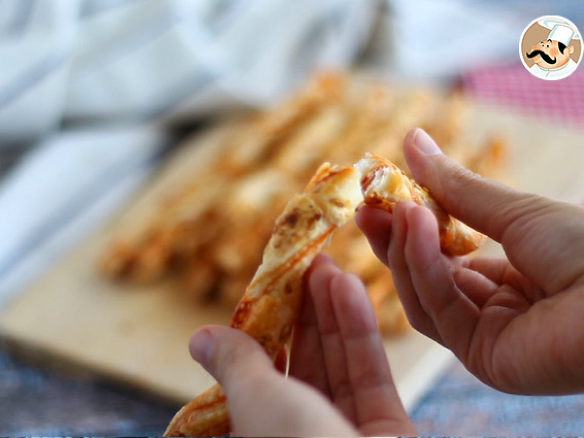 Ingredientele necesare sunt: 1 aluat de foietaj, 3 linguri de sos de roșii, semințe de susan și 1 ou.