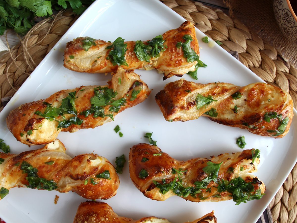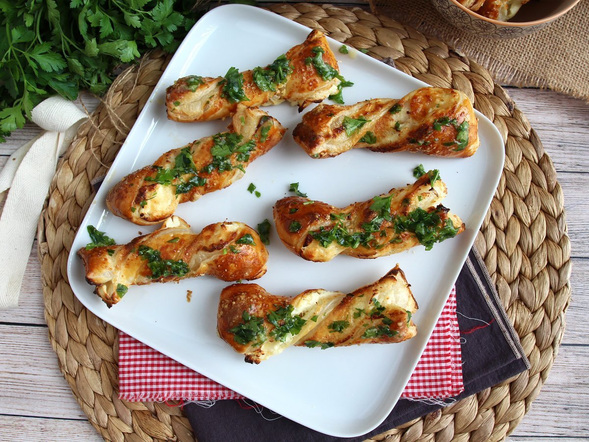 Ingredientele principale includ aluat foietaj, cremă de brânză, parmezan, ou, unt, pudră de usturoi și pătrunjel proaspăt.