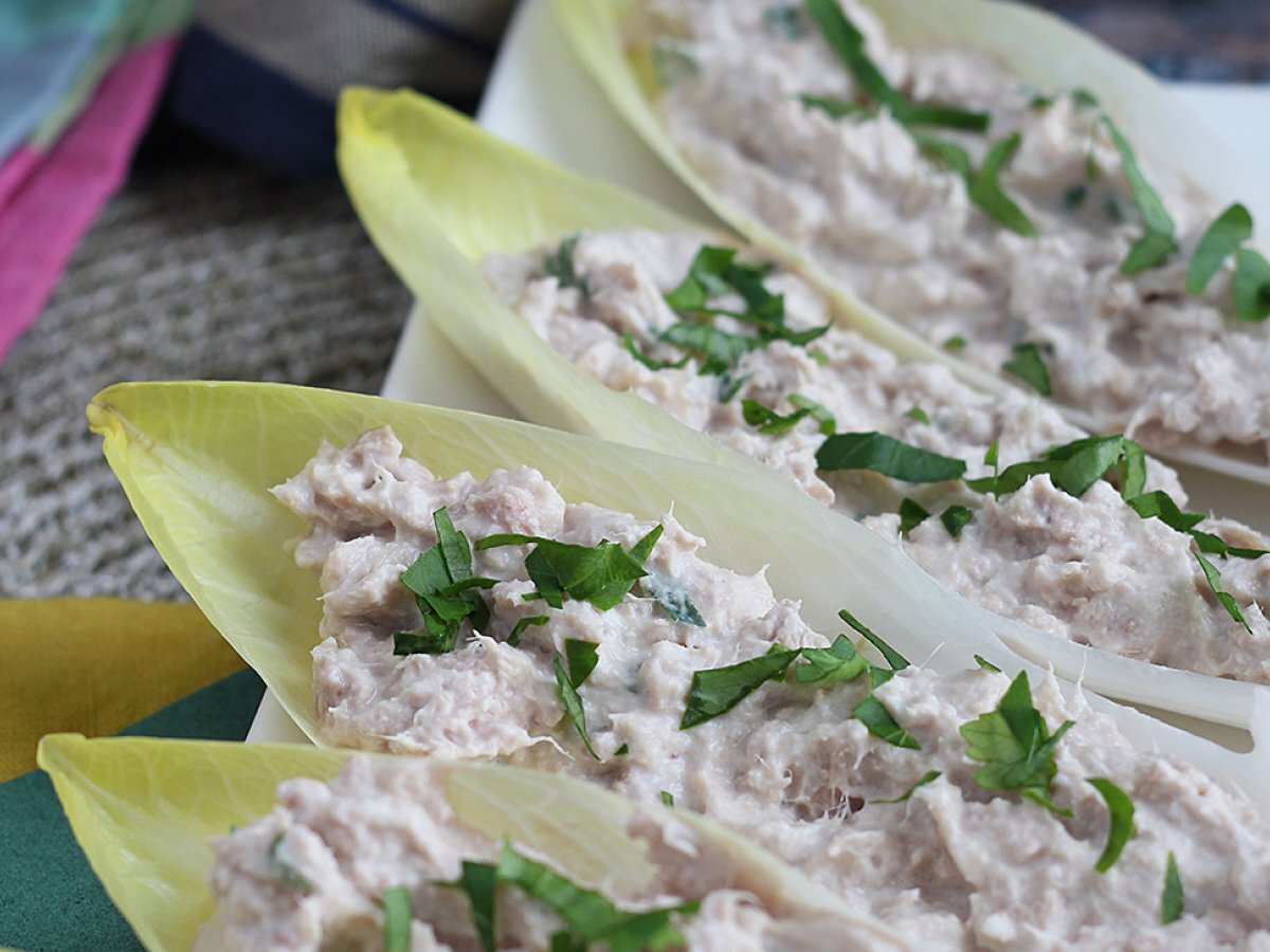Pentru un aperitiv expres fara gatit, incercati aceste barcute din andive! Pentru umplutura, amestecati tonul, branza Petits-Suisses, patrunjelul si ... atat!