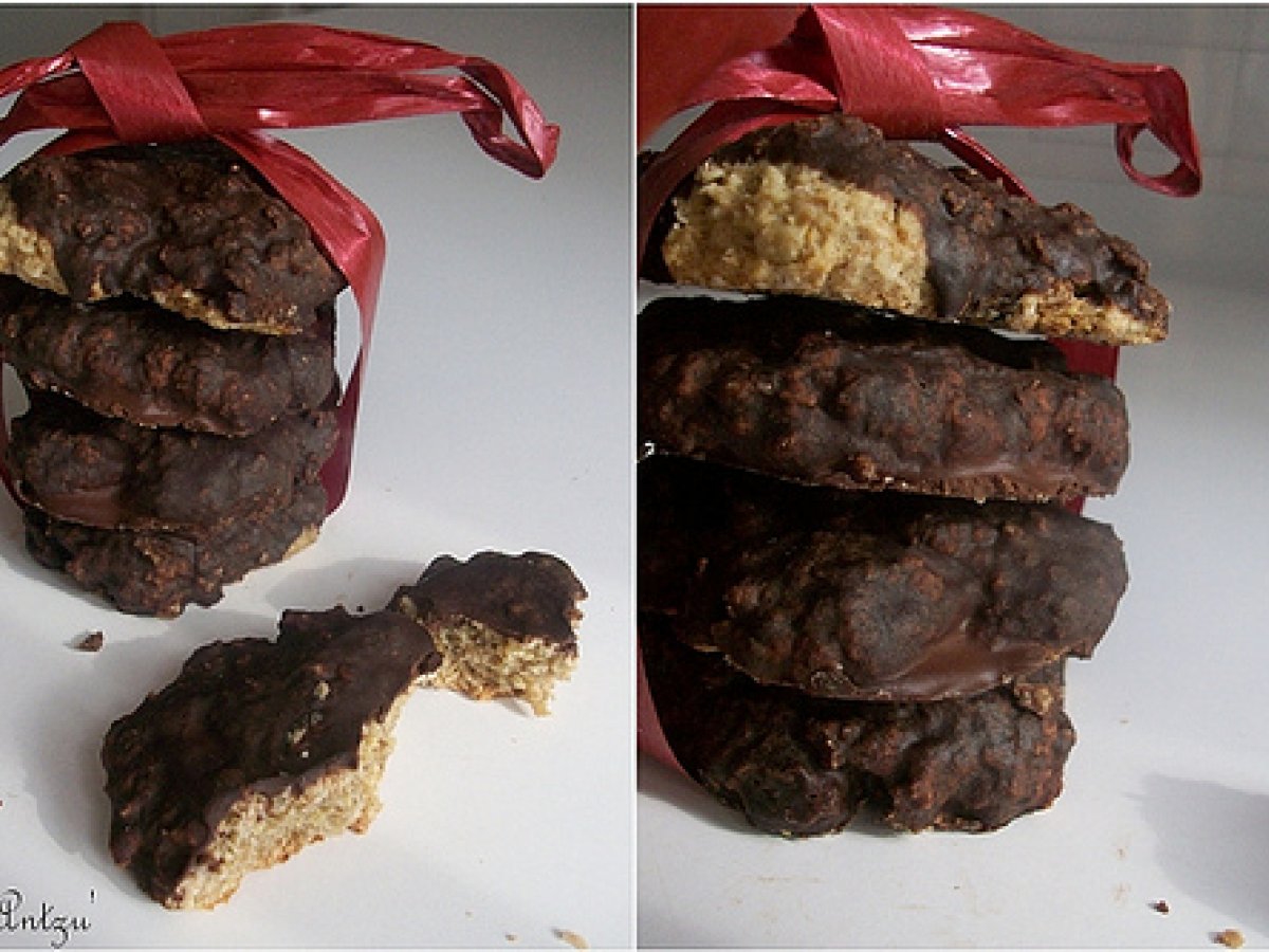 Biscuiti de ovaz cu ciocolata si stafide PrecedentulUrmătorul AperitivFoarte ușor45 min Trimite unui prieten Printează pagina Adresează o întrebare autorului Postează o poză cu rețeta gătită de tine Ingrediente 4 100-120 g unt 20 linguri lapte 1 esenta de migdale coaja de lamaie 2 cani de fulgi de ovaz 1 cana jumatate de faina integrala 1 lingurita praf de copt o mana buna de stafide Glazura aprox 60 g ciocolata amaruie 85 % cacao(o ciocolata de la Heidi are 80 g) 2 linguri smantana