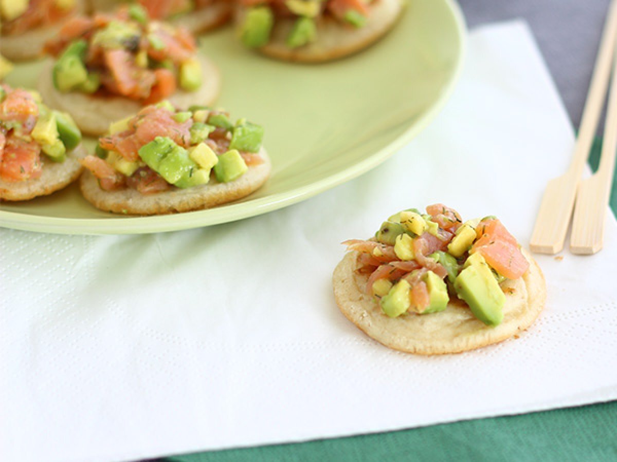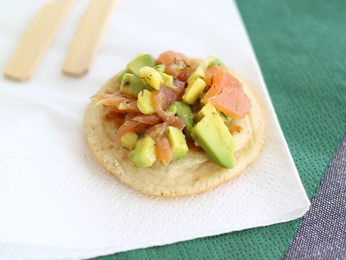 Combinatia de somon si avocado servita pe blini, face din acest preparat un aperitiv-vedeta.