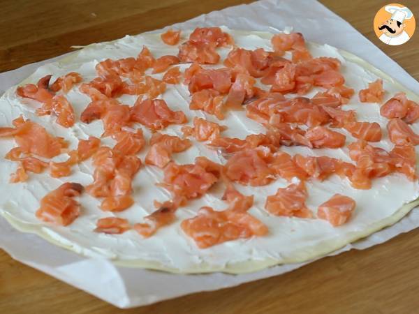 Taiati feliile de somon afumat si fileul de somon in fasii. Distribuiti somonul taiat pe suprafata aluatului.