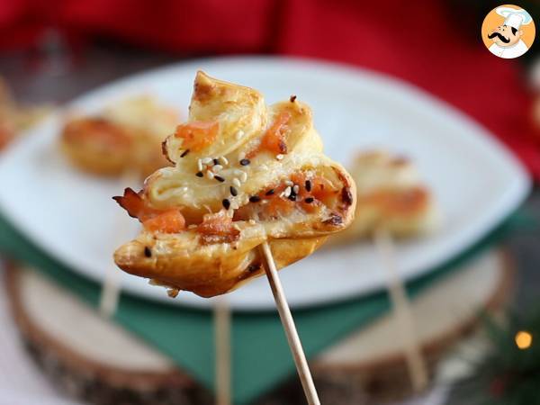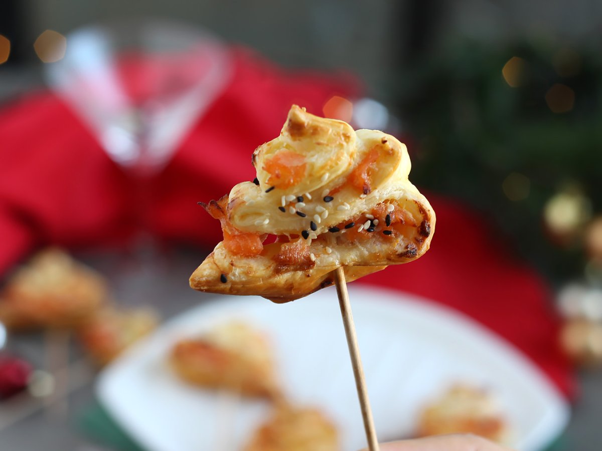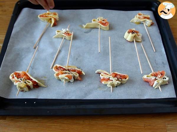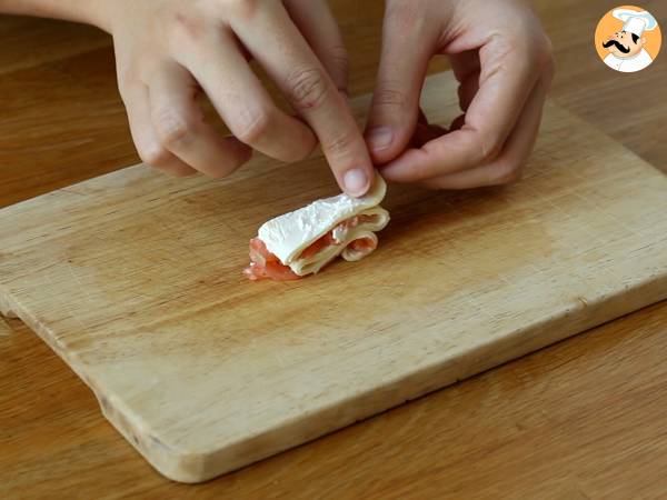Ingredientele principale sunt crema de branza, file de somon crud, somon afumat, aluat de foietaj, ou si susan.