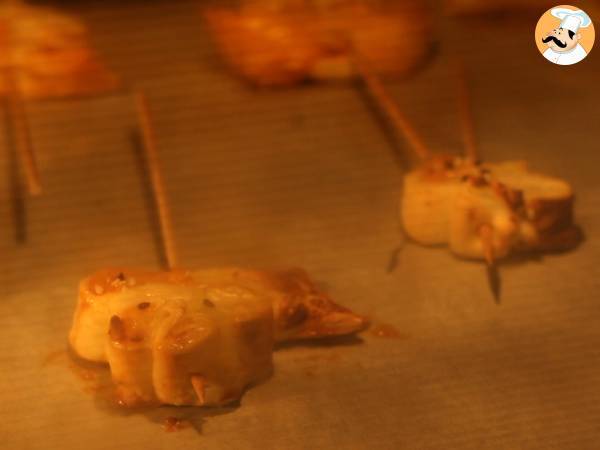 Asezati bradurii pe o tava de copt in care ati pus hartie de copt si periati cu ou batut. Se presara cu susan.