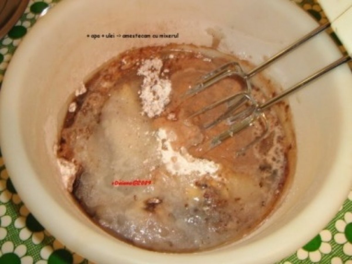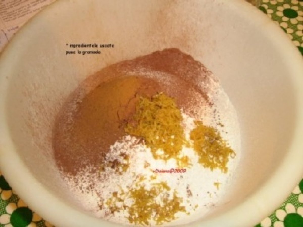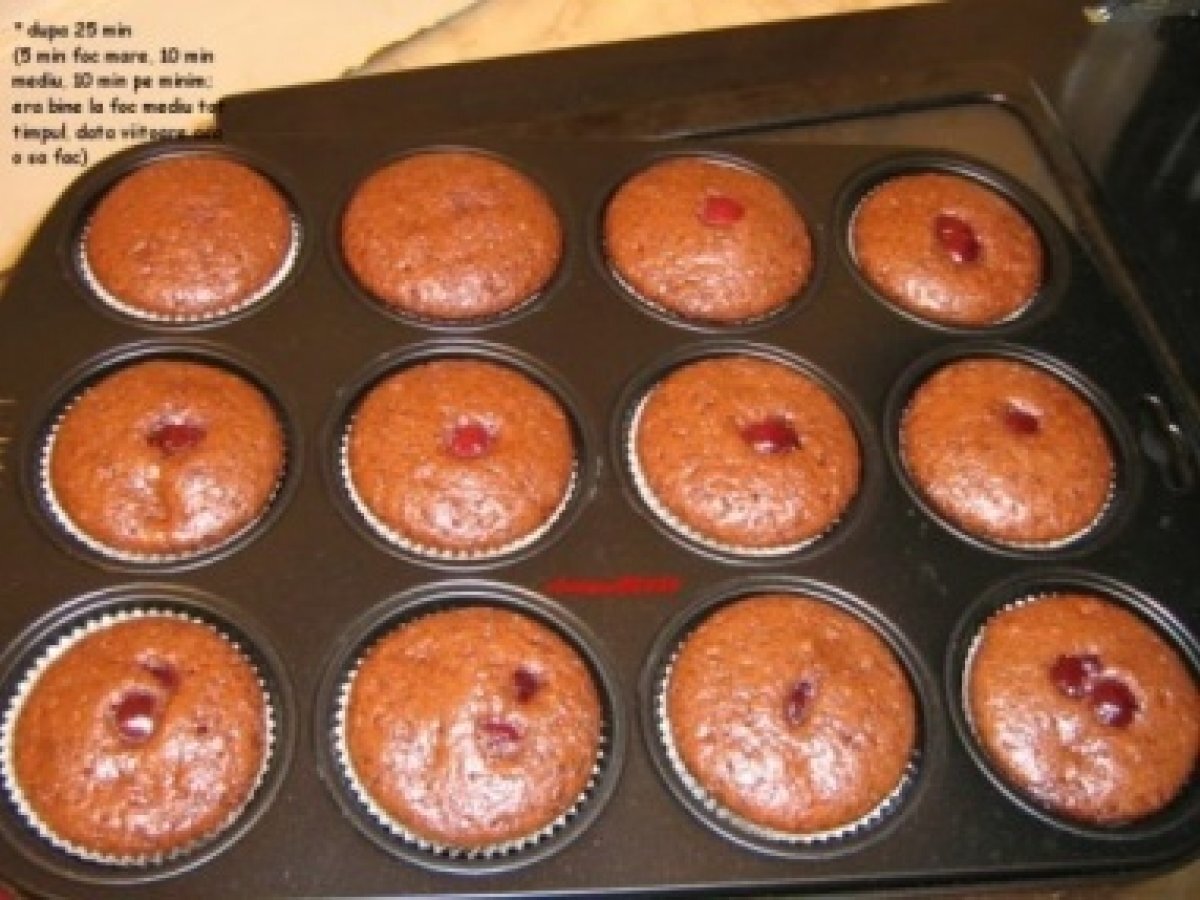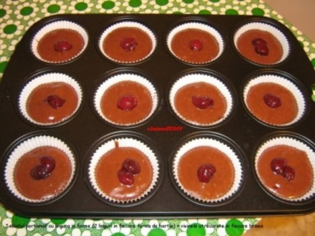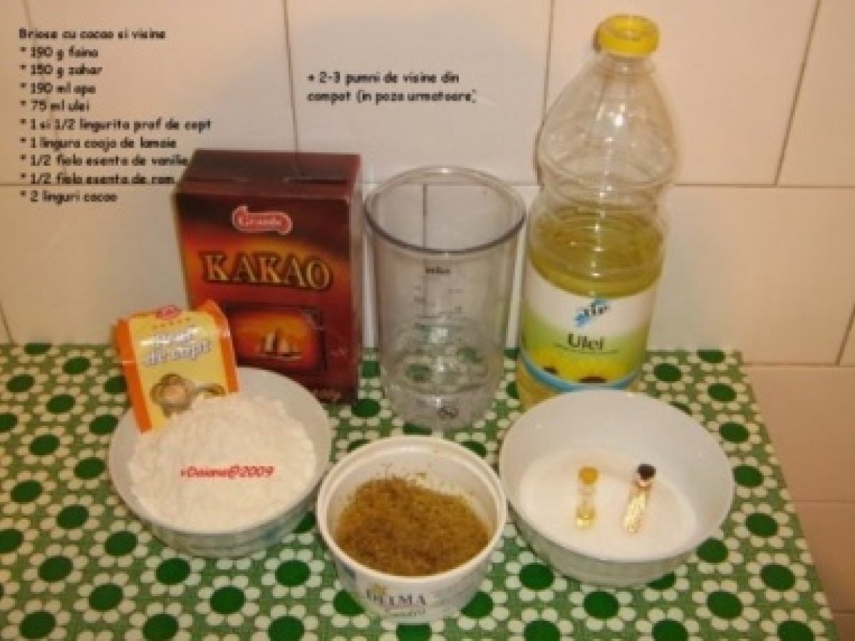 Briose cu cacao si visine PrecedentulUrmătorul AperitivFoarte ușor55 min Trimite unui prieten Printează pagina Adresează o întrebare autorului Postează o poză cu rețeta gătită de tine Ingrediente 4 190 g faina 150 g zahar 190 ml apa 75 ml ulei 1 si jumatate lingurita praf de copt 1 lingura coaja rasa de lamaie 1/2 fiola esenta de vanilie 1/2 fiola esenta de rom 2 linguri cacao 2-3 pumni de visine (proaspete sau dun compot, fara samburi)