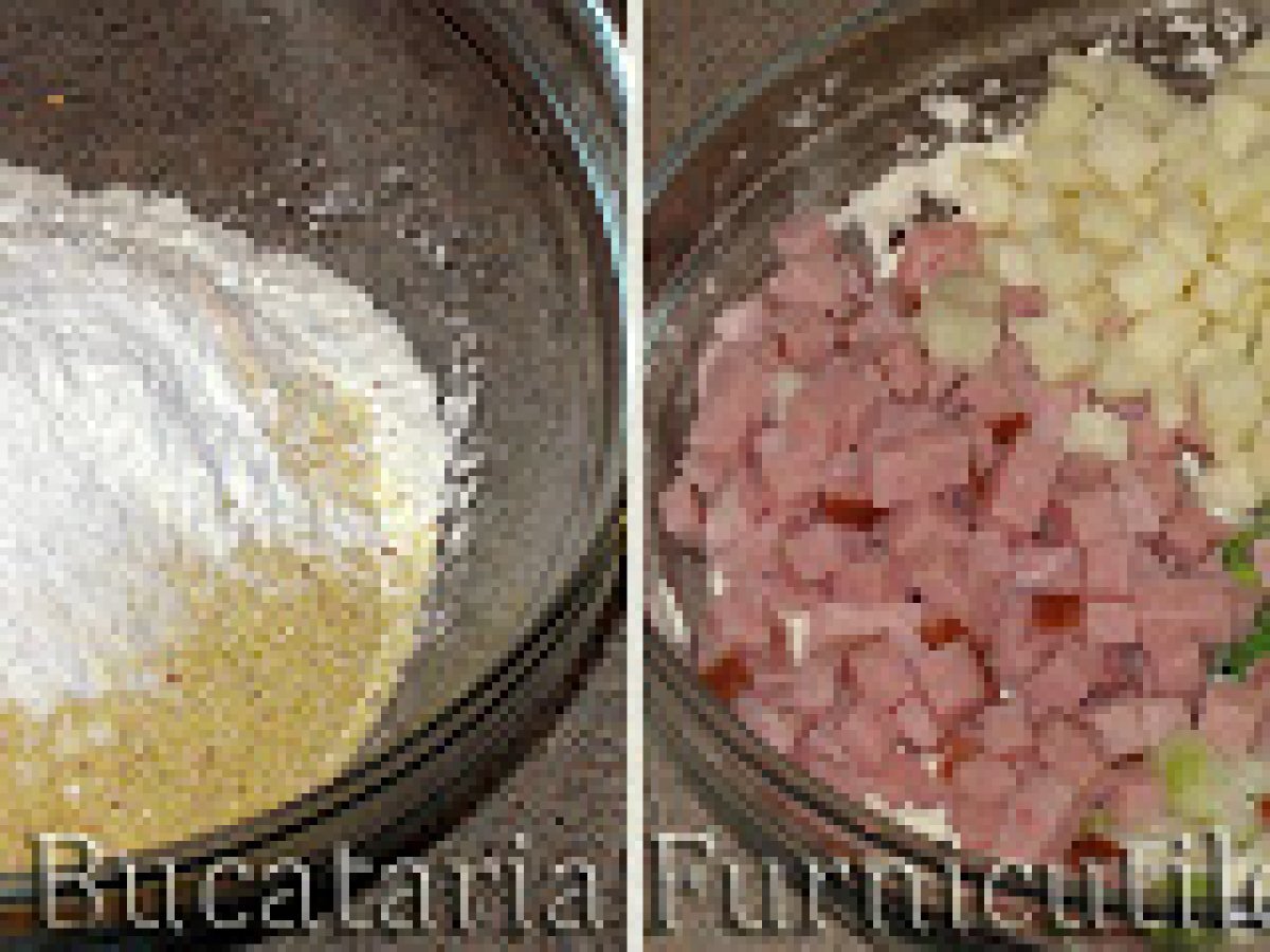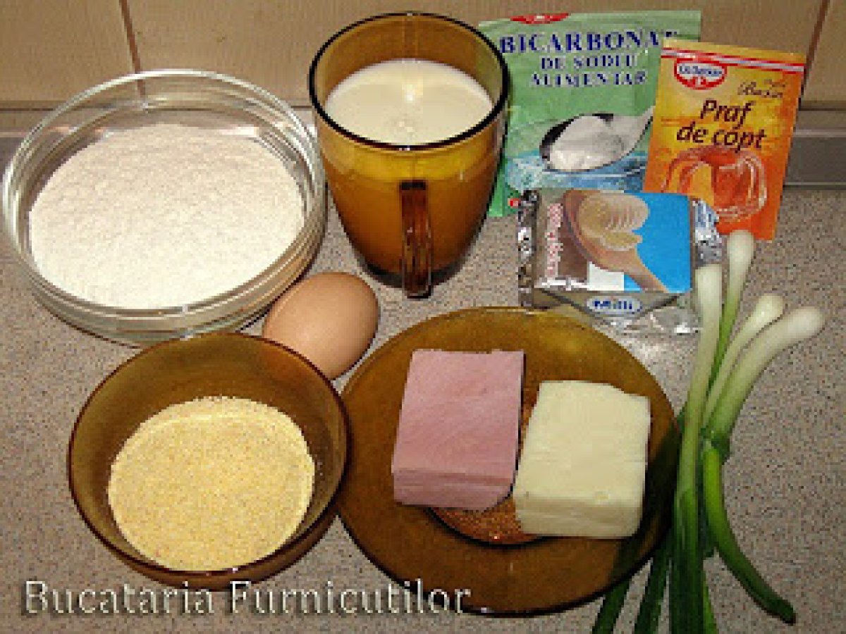 Briose cu cascaval si sunca PrecedentulUrmătorul AperitivFoarte ușor1 h 15 m Trimite unui prieten Printează pagina Adresează o întrebare autorului Postează o poză cu rețeta gătită de tine Ingrediente 4 180 g faina 2 linguri malai (40 g) 1 cana de lapte (250 ml) 1 ou 2 linguri unt (40 g) 80 g cascaval 80 g sunca (muschi file) 1 legatura ceapa verde 2 lingurite praf de copt jumatate lingurita de bicarbonat de sodiu
