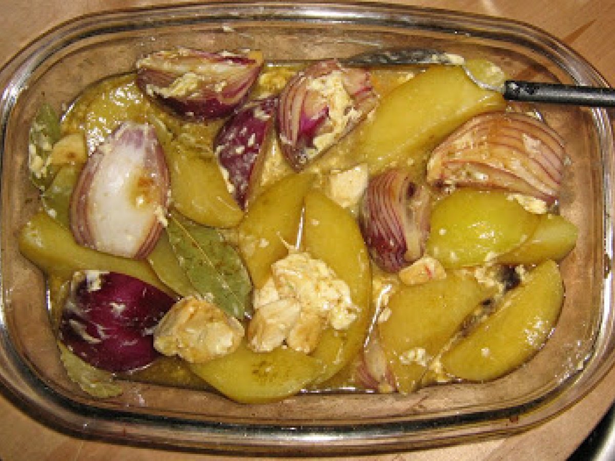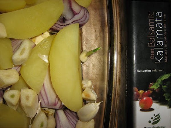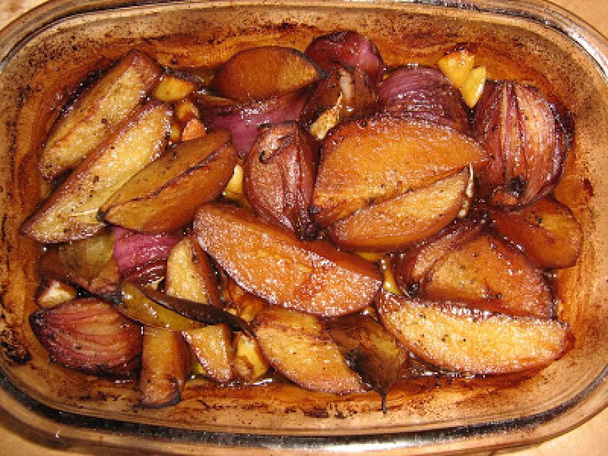 Cartofi si ceapa rosie la cuptor cu otet balsamic PrecedentulUrmătorul AperitivFoarte ușor1 h 15 m Trimite unui prieten Printează pagina Adresează o întrebare autorului Postează o poză cu rețeta gătită de tine Ingrediente 2 3 cartofi 2 cepe 4 fosii de dafin rozmarin sare & piper 1/3 pachet de unt o capatana de usturoi taiata pe jumatate ulei de masline dupa gust 1/2 sticla de otet balsamic (cca 125 ml)