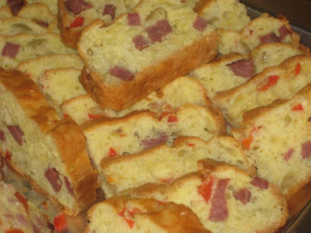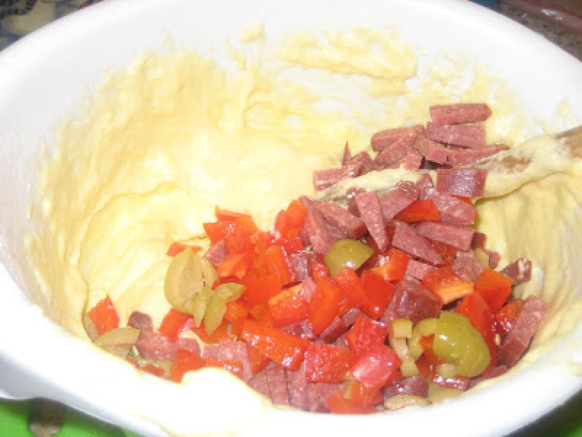 Chec aperitiv cu salam ,masline si ardel rosu PrecedentulUrmătorul AperitivFoarte ușor1 h 10 m Trimite unui prieten Printează pagina Adresează o întrebare autorului Postează o poză cu rețeta gătită de tine Ingrediente 4 5 oua 5 lin de faina 200 g de salam 130 g de cascaval razuit o lingurita de praf de copt sare si piper