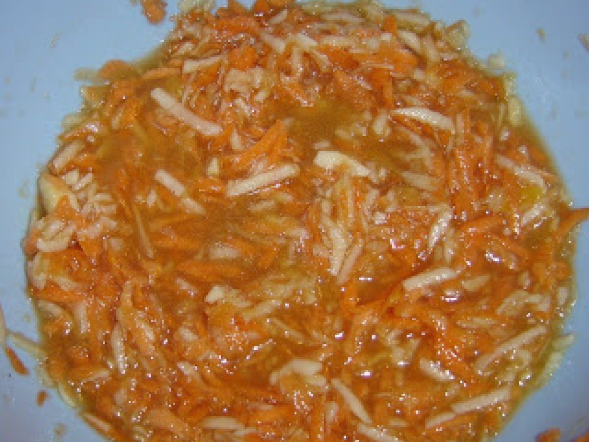 Chec cu morcovi si mar PrecedentulUrmătorul AperitivFoarte ușor1 h 15 m Trimite unui prieten Printează pagina Adresează o întrebare autorului Postează o poză cu rețeta gătită de tine Acesta este foarte aromat si bun . Ingrediente 2 200 g zahar sucul de la o portocala 100 ml apa minerala 50 ml ulei 1 lingura scortisoara 300 g faina 1 lingurita bicarbonat 1 lingurita praf de copt