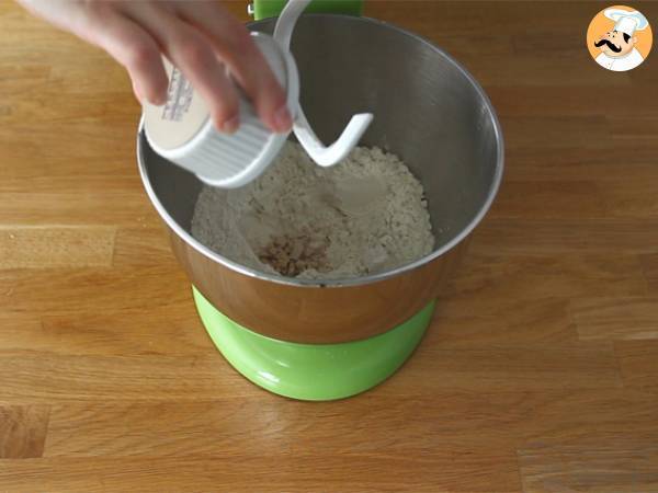In vasul robotului puneti faina, sarea si zaharul si formati o gropita. Puneți drojdia zdrobita (aveti grija sa nu atinga sarea!). Adaugati apa si laptele si framantati la viteza medie timp de cateva minute.