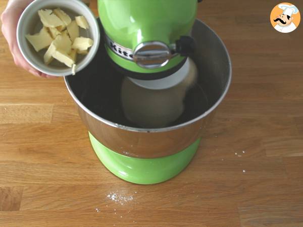 Apoi adaugati untul taiat in bucati mici, putin cate putin, in timp ce framantati. Dupa ce untul este bine incorporat, lasati aluatul sa creasca la temperatura camerei timp de 1 ora.