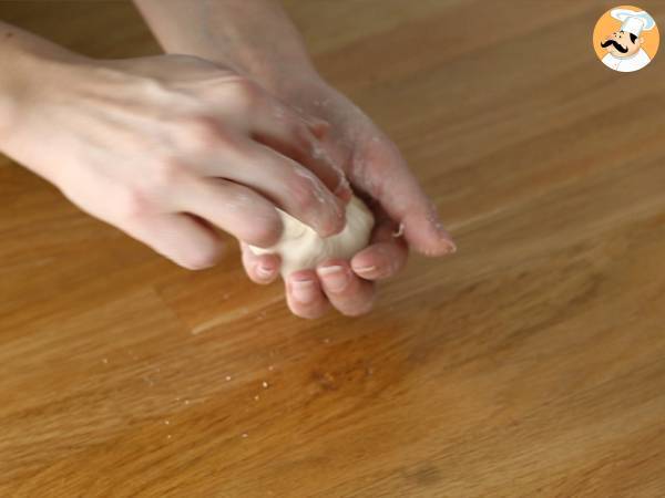 Dupa acest timp, formati bile de aluat de aproximativ 50 gr. Luati o minge si intindeti-o in mana.