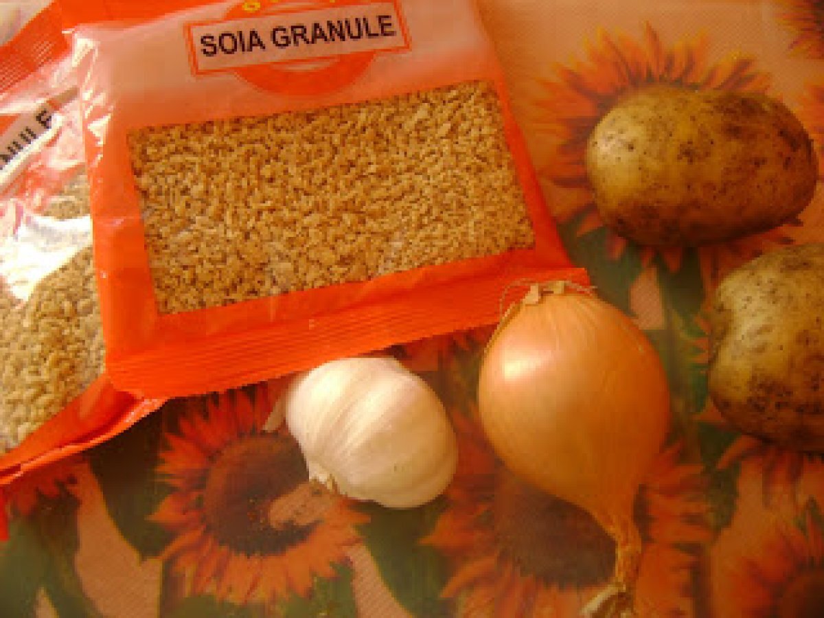 Chiftele din soia PrecedentulUrmătorul AperitivFoarte ușor50 min Trimite unui prieten Printează pagina Adresează o întrebare autorului Postează o poză cu rețeta gătită de tine Ingrediente 4 1-2 pachete de soia granule 1-2 cartofi 1 ceapa 3-4 catei usturoi verdeata sare,piper pesmet ulei pt prajit