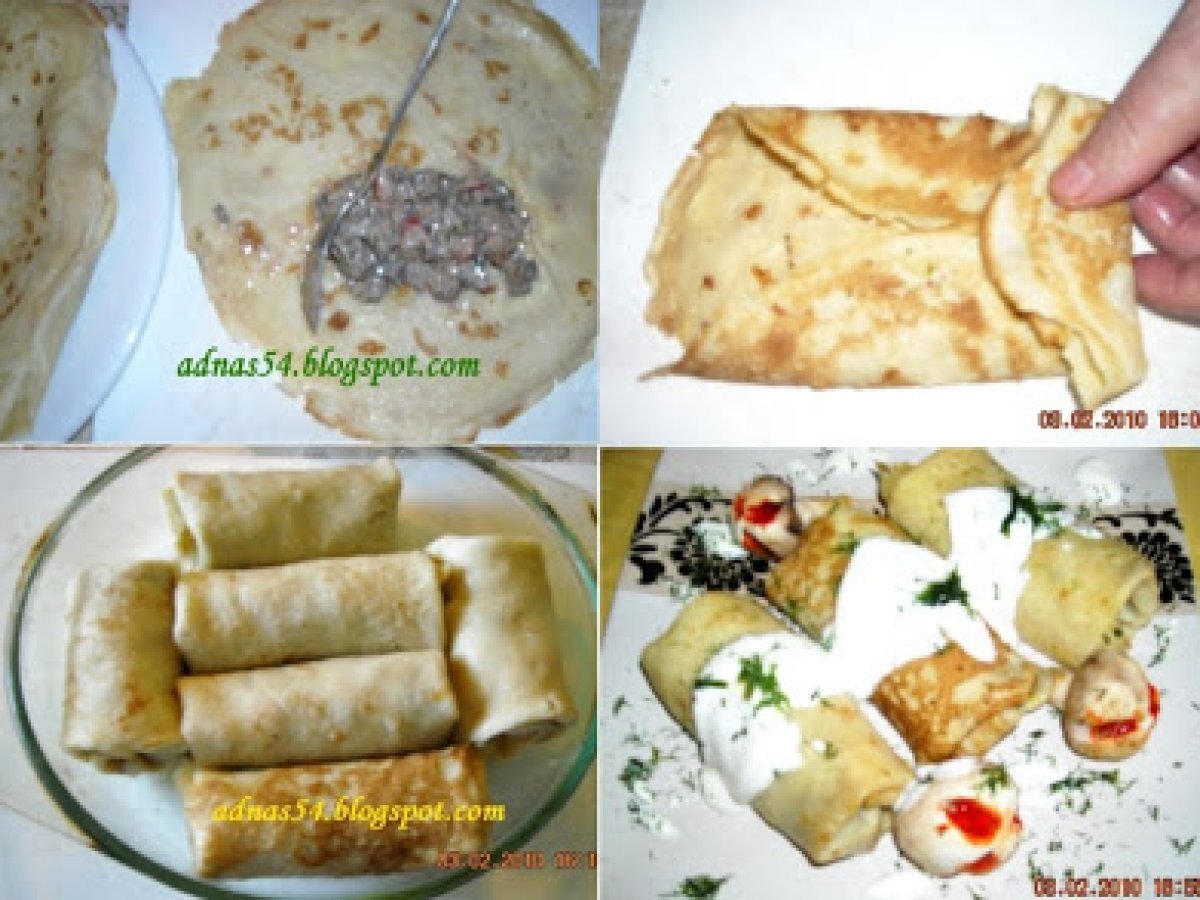Clatite cu ciuperci la cuptor PrecedentulUrmătorul AperitivFoarte ușor30 min Trimite unui prieten Printează pagina Adresează o întrebare autorului Postează o poză cu rețeta gătită de tine Ingrediente 4 Ingrediente clatite 2 oua 200 g faina 2 linguri de unt varf de lingurita de sare 1 lingurita rasa de bicarbonat 300 ml lapte Ingrediente umplutura: 500 g ciuperci 50 g ceapa 200 ml smintina 50 g parmezan sau cascaval ras 1 legatura marar sau patrunjel piper, sare