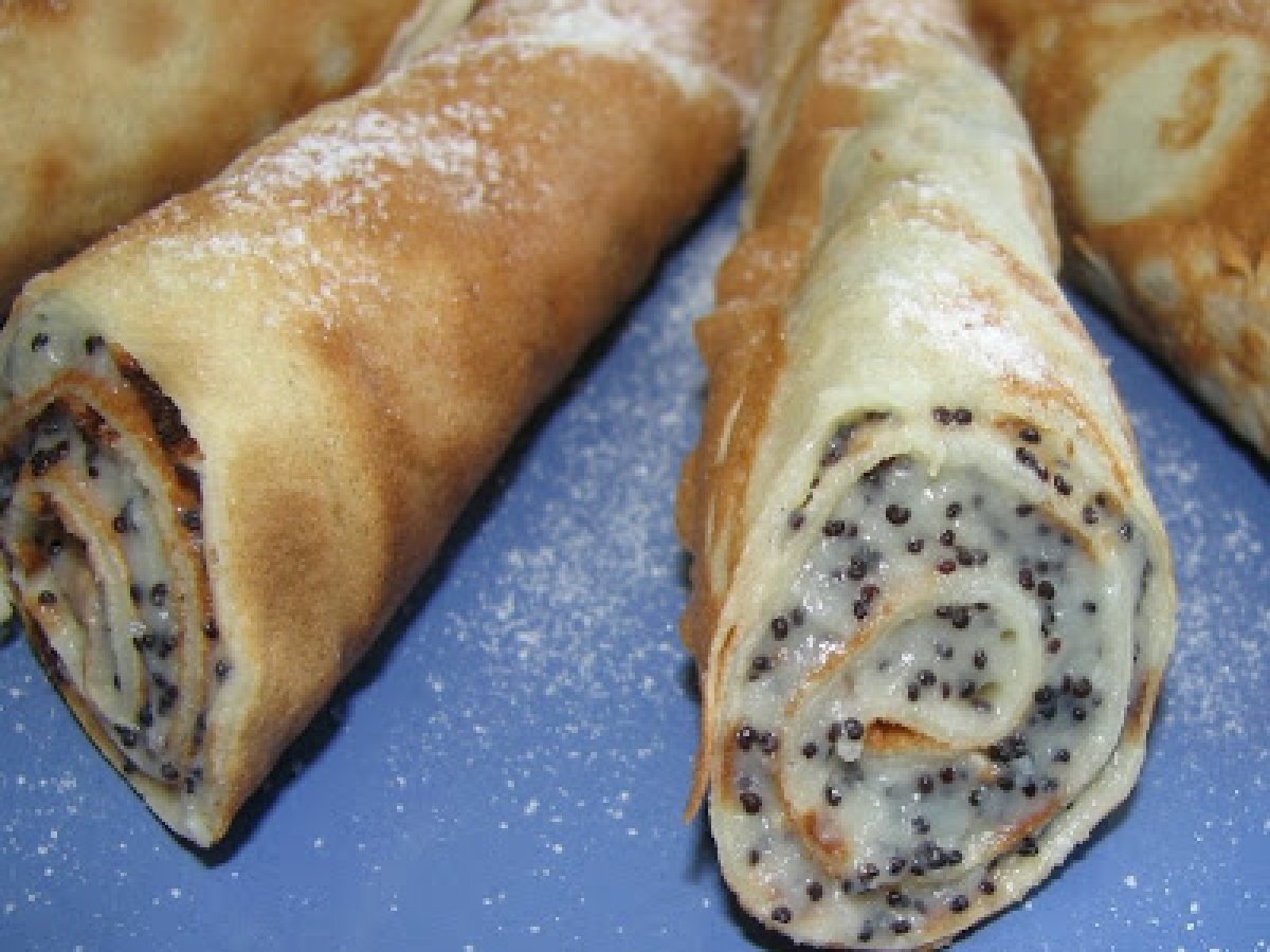 Clatite cu mac PrecedentulUrmătorul AperitivFoarte ușor25 min Trimite unui prieten Printează pagina Adresează o întrebare autorului Postează o poză cu rețeta gătită de tine Ingrediente 5 Pentru clatite : 300 ml lapte 200 ml apa minerala 500 g faina 4 oua 4 linguri de ulei esente sare Pentru crema de mac: 3 oua 750 ml lapte 100 g mac 75 g faina 250 g zahar pudra cu aroma de vanilie sare