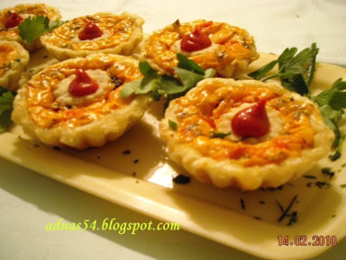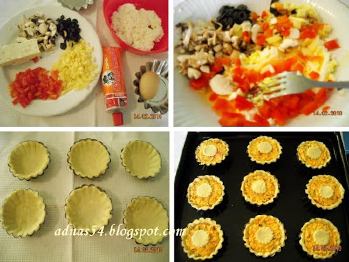 Cosulete aperitiv cu branza, masline si ciuperci PrecedentulUrmătorul AperitivFoarte ușor50 min Trimite unui prieten Printează pagina Adresează o întrebare autorului Postează o poză cu rețeta gătită de tine Ingrediente 4 400 g. foietaj 250 g. branza dulce 150 g. branza sarata 100 g.masline feliate 100 g. cascaval ras 1 ou 3-4 linguri de smantana sare, piper boia dulce verdeata