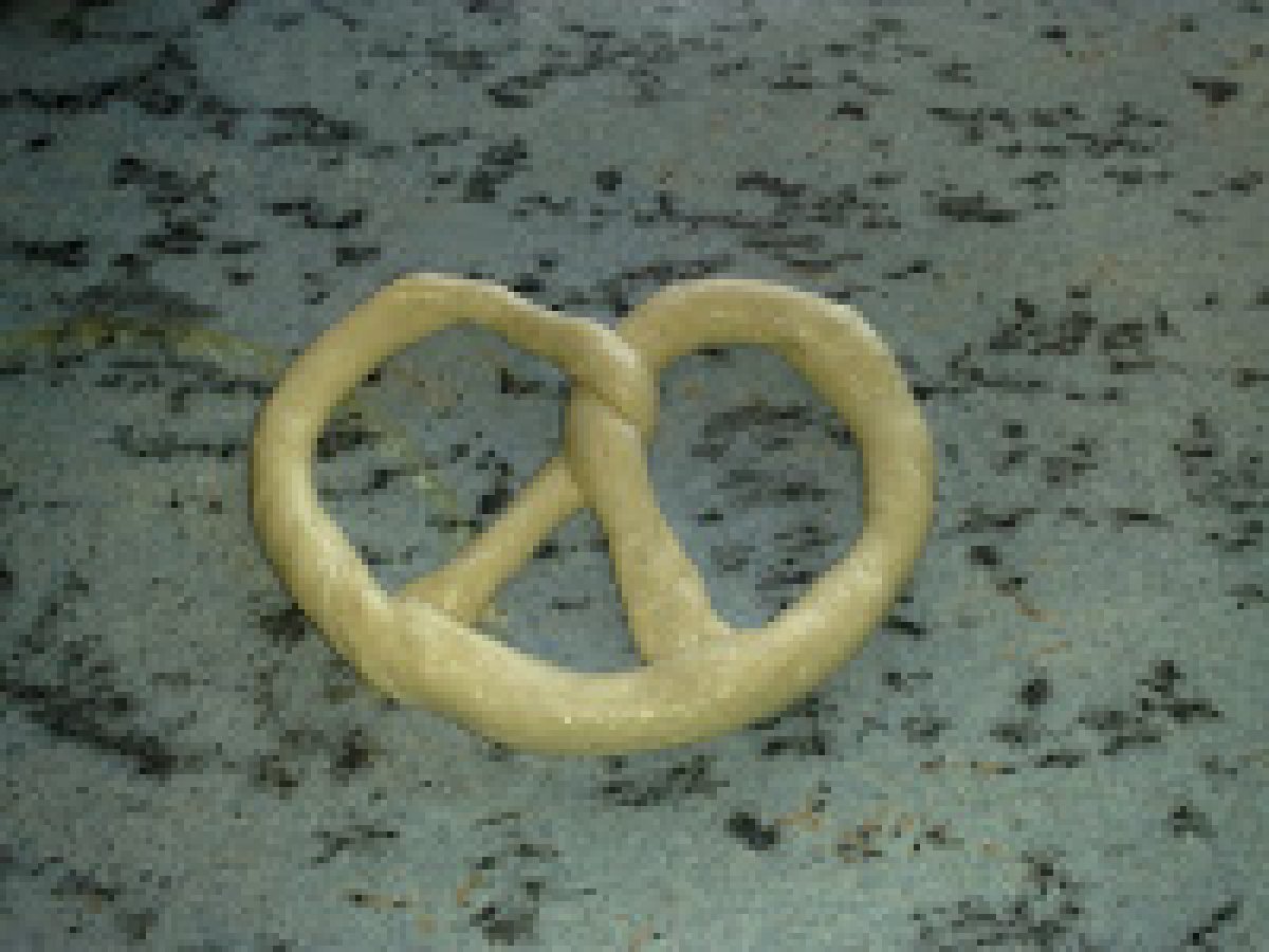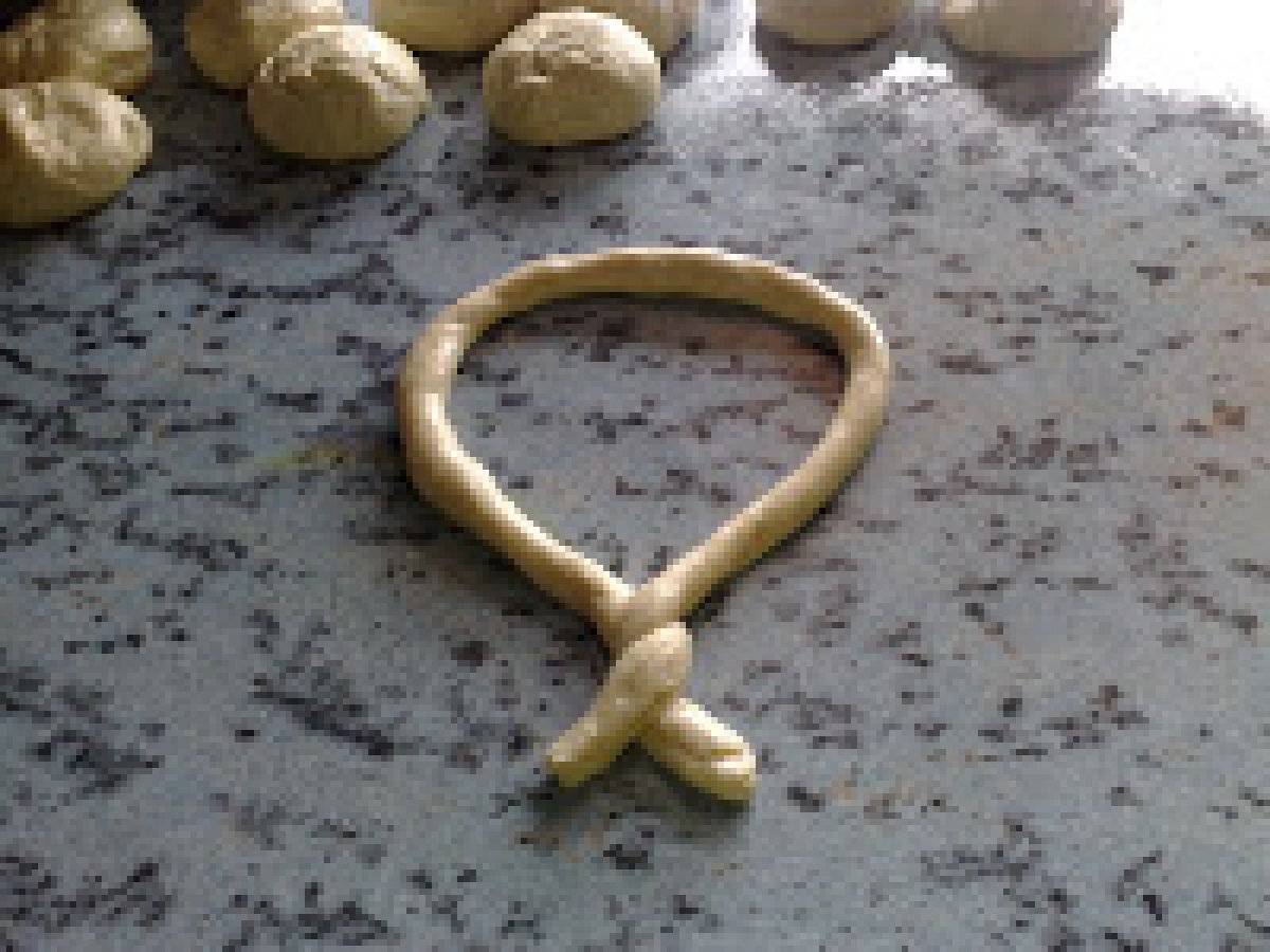 - Fiecare bila se ia si se intinde un snur lung de aprox 40-50 cm . Se indoaie in doua iar capetele se rasucesc de doua ori . Se prinde de partea opusa nodului si se aduce pana peste capetele ramase in urma suciturii, nodul ramanand in centrul covrigului.