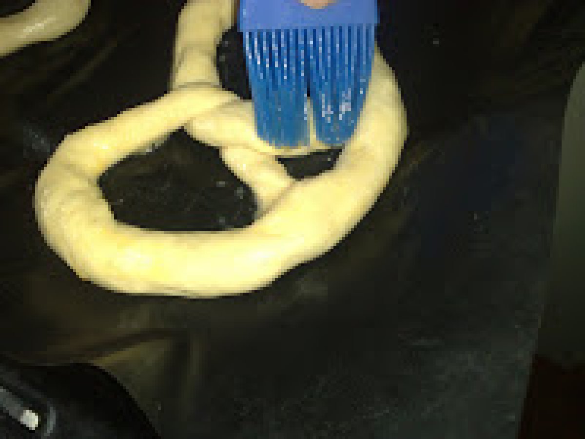 Se pun pe hartie de copt si se mai lasa sa creasca timp de 5 min. aprox. - Intr-o tava de cuptor normal incap patru covrigi.Dupa ce a trecut acest timp , se ung cu ou si de baga la cuptor la 240 grade .
